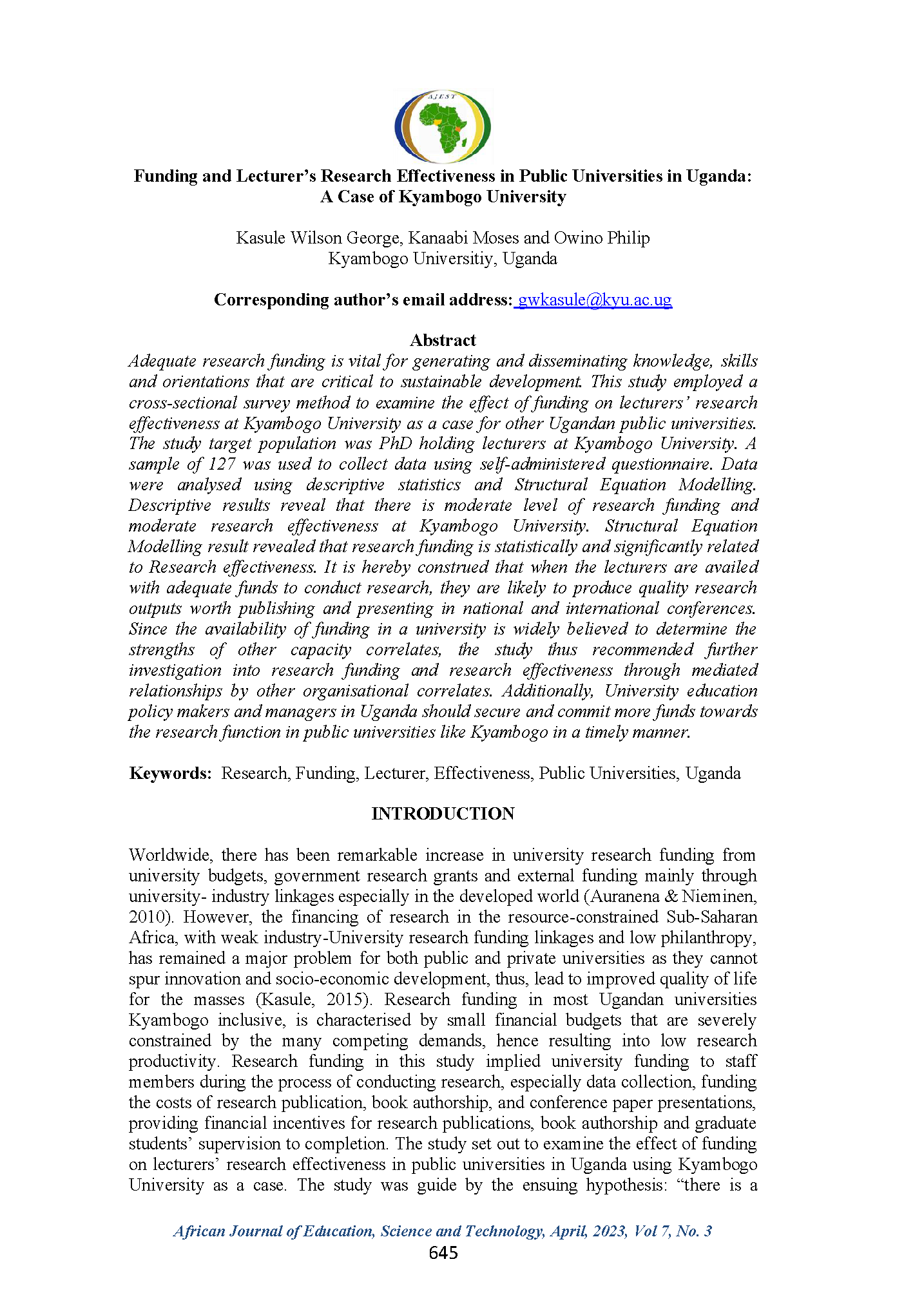 Kasule, G. W., Kanaabi, M., & Owino, P. (2023). Funding and Lecturer’s Research Effectiveness in Public Universities in Uganda: A Case of Kyambogo University. African Journal of Education, Science and Technology, 7(3), 653-661.