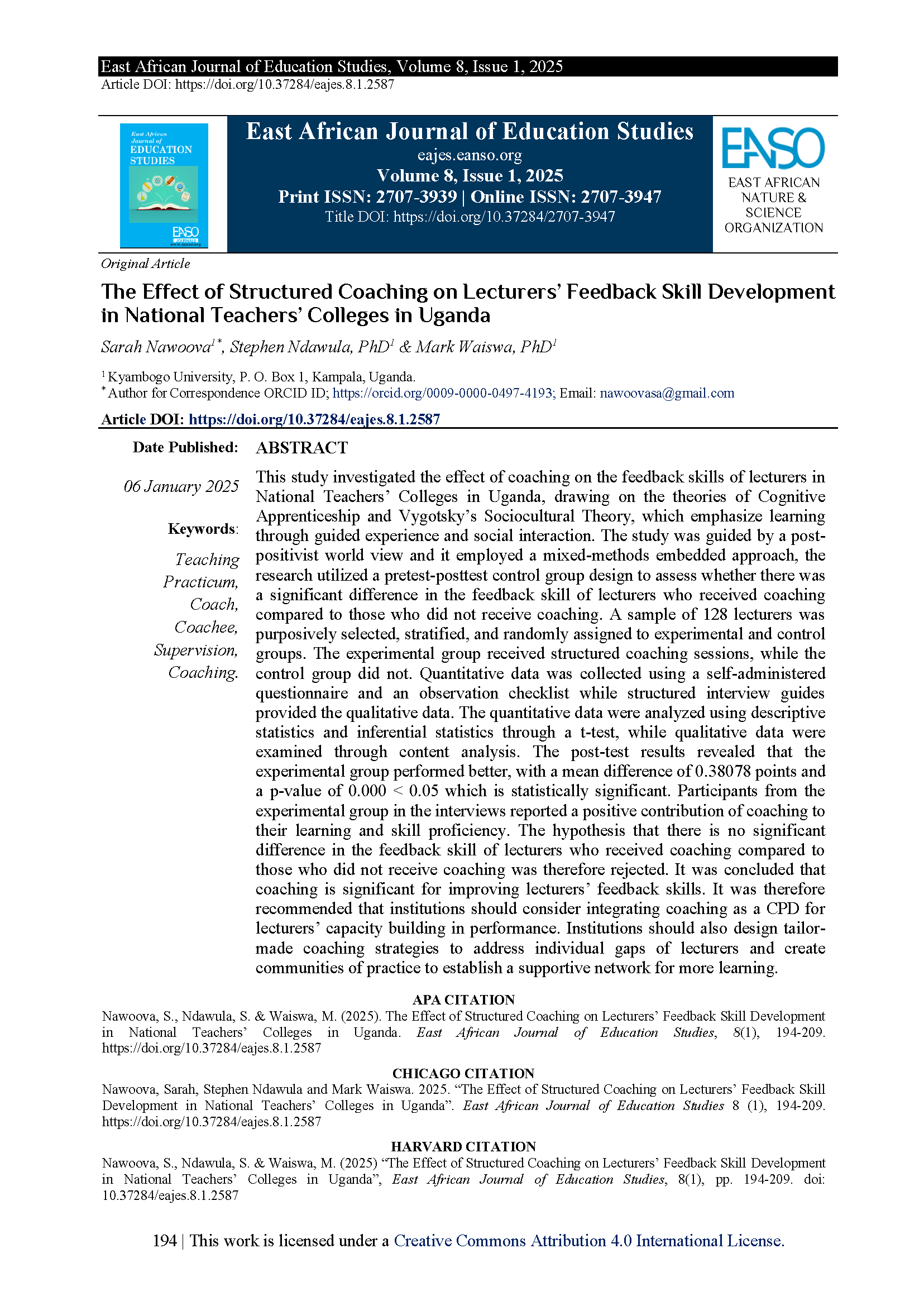 Nawoova, S., Ndawula, S., & Waiswa, M. (2024). The Effect of Structured Coaching on Lecturers’ Feedback Skill Development in National Teachers’ Colleges in Uganda. East African Journal of Education Studies, 8(1), 194-209.