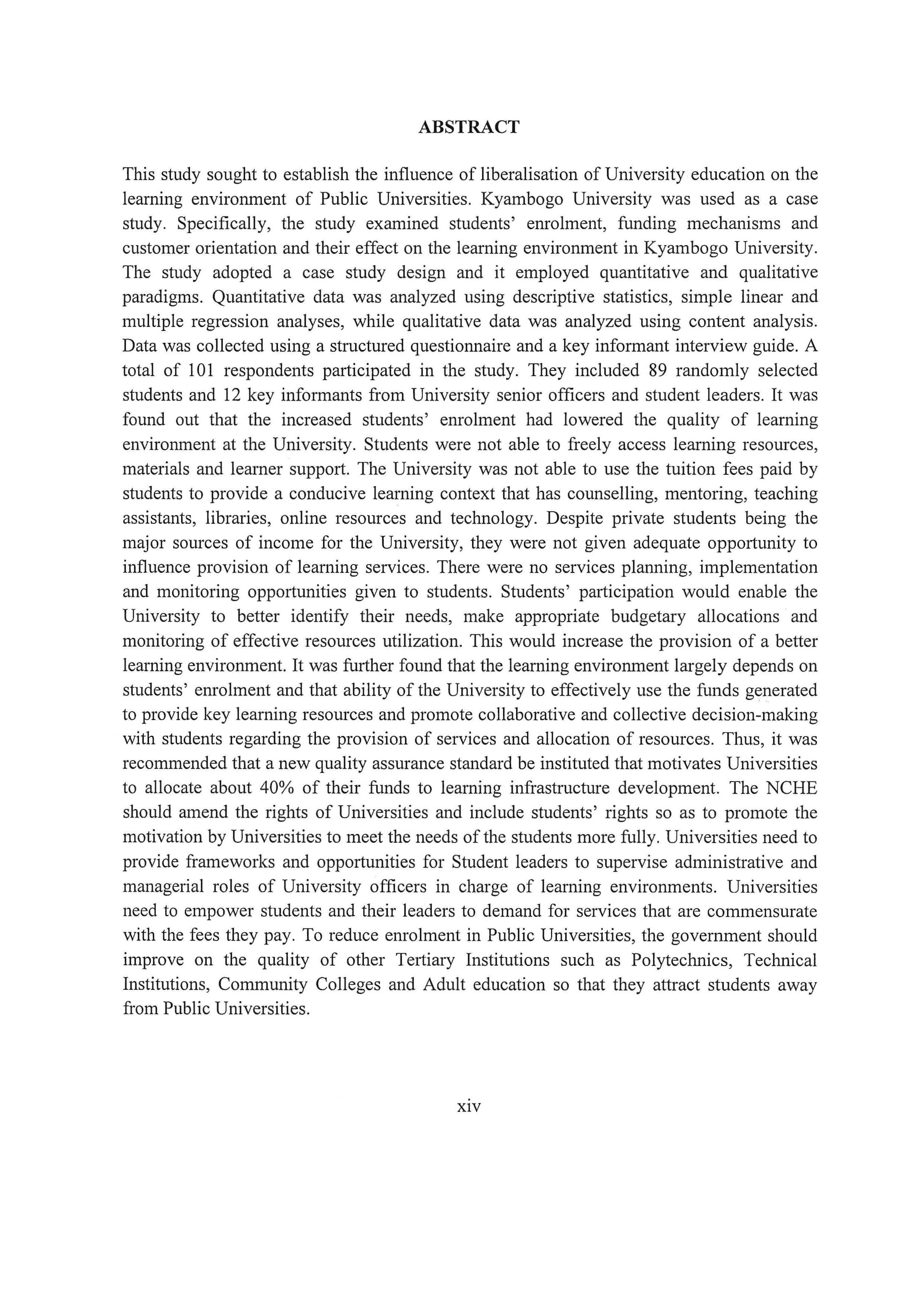`This study sought to establish the influence of liberalisation of University education on the learning environment of Public Universities. Kyambogo University was used as a case study. Specifically, the study examined students' enrolment, funding mechanisms and customer orientation and their effect on the learning environment in Kyambogo University.
