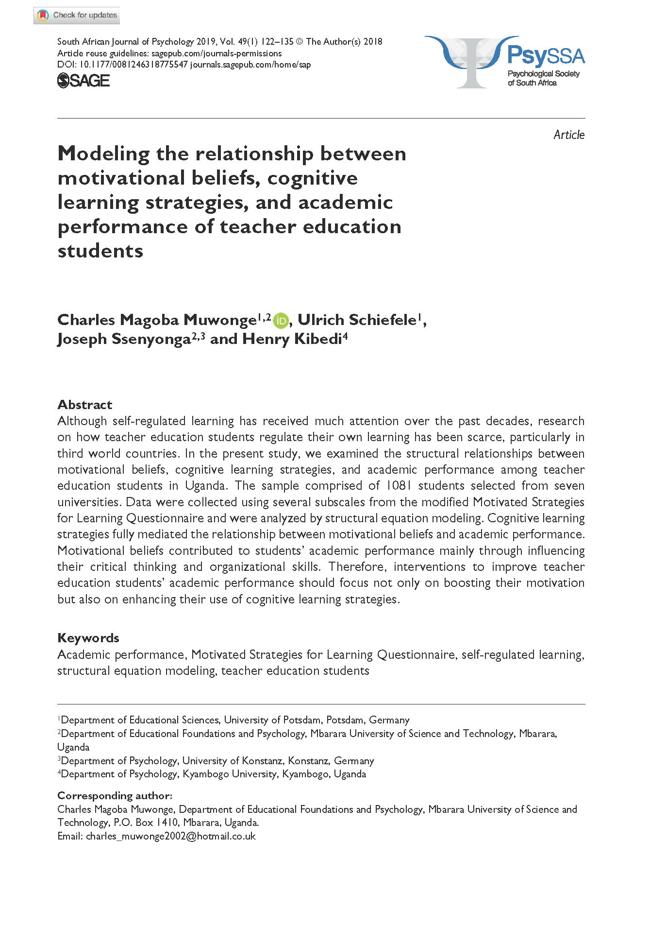 Muwonge, C. M...et al (2019). Modeling the relationship between motivational beliefs, cognitive learning strategies, and academic performance of teacher education student. South African Journal of Psychology . https://doi.org/10.1177/00812463187755.