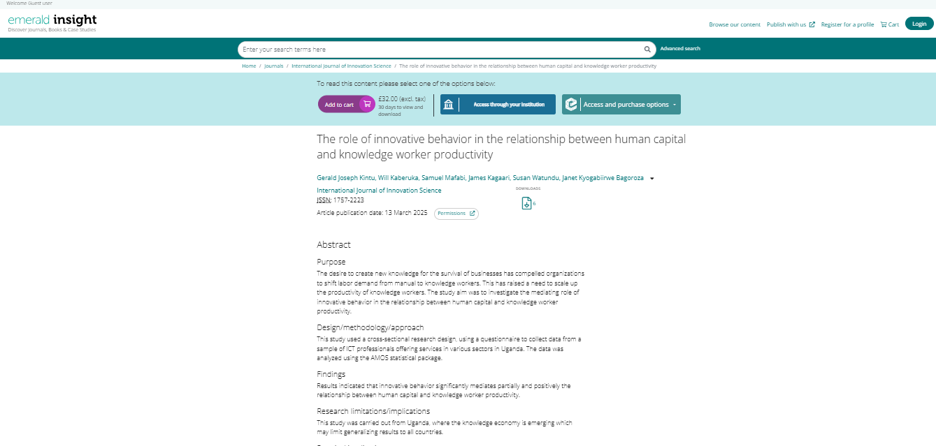 Kintu, G.J., Kaberuka, W., Mafabi, S., Kagaari, J., Watundu, S. and Bagoroza, J.K. (2025), "The role of innovative behavior in the relationship between human capital and knowledge worker productivity", International Journal of Innovation Science