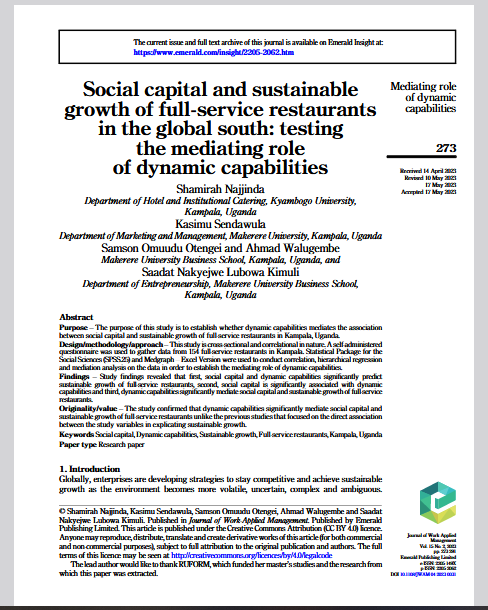 | dc.description.abstract | Purpose – The purpose of this study is to establish whether dynamic capabilities mediates the association between social capital and sustainable growth of full-service restaurants in Kampala, Uganda. Design/methodology/approach – This study is cross-sectional and correlational in nature. A self-administered questionnaire was used to gather data from 154 full-service restaurants in Kampala. Statistical Package for the Social Sciences (SPSS.25) and Medgraph – Excel Version were used to conduct correlation, hierarchical regression and mediation analysis on the data in order to establish the mediating role of dynamic capabilities. Findings – Study findings revealed that first, social capital and dynamic capabilities significantly predict sustainable growth of full-service restaurants, second, social capital is significantly associated with dynamic capabilities and third, dynamic capabilities significantly mediate social capital and sustainable growth of full-service restaurants. Originality/value – The study confirmed that dynamic capabilities significantly mediate social capital and sustainable growth of full-service restaurants unlike the previous studies that focused on the direct association between the study variables in explicating sustainable growth. | en_US |