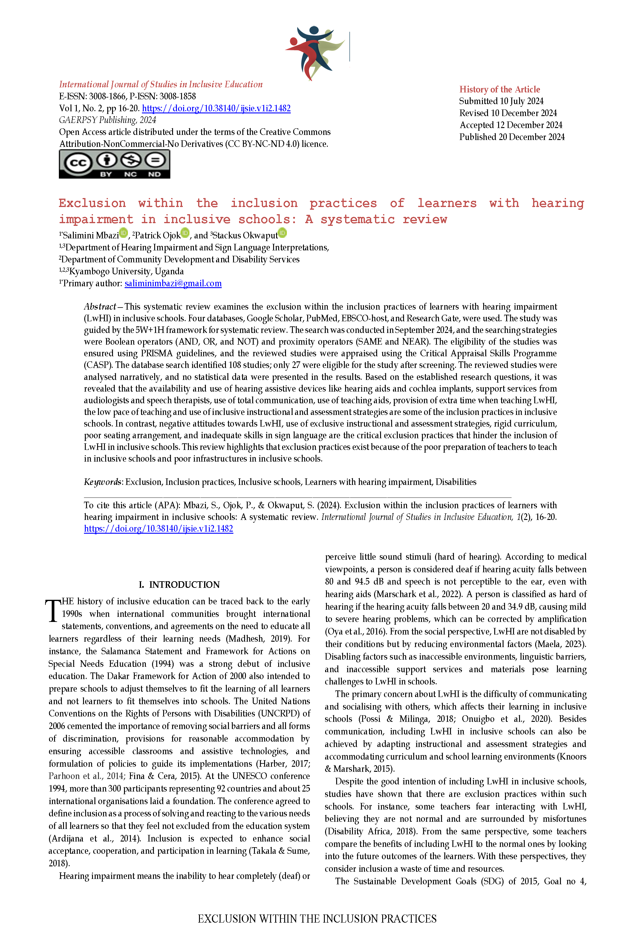 Mbazi, S., Ojok, P., & Okwaput, S. (2024). Exclusion within the inclusion practices of learners with hearing impairment in inclusive schools: A systematic review. International Journal of Studies in Inclusive Education, 1(2), 16-20.