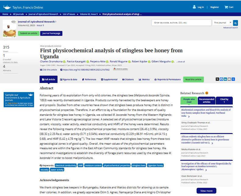 Oromokoma, C., Kasangaki, P., Akite, P., Mugume, R., Kajobe, R., Mangusho, G., ... & Chemurot, M. (2023). First physicochemical analysis of stingless bee honey from Uganda. Journal of Apicultural Research, 62(5), 1240-1249.