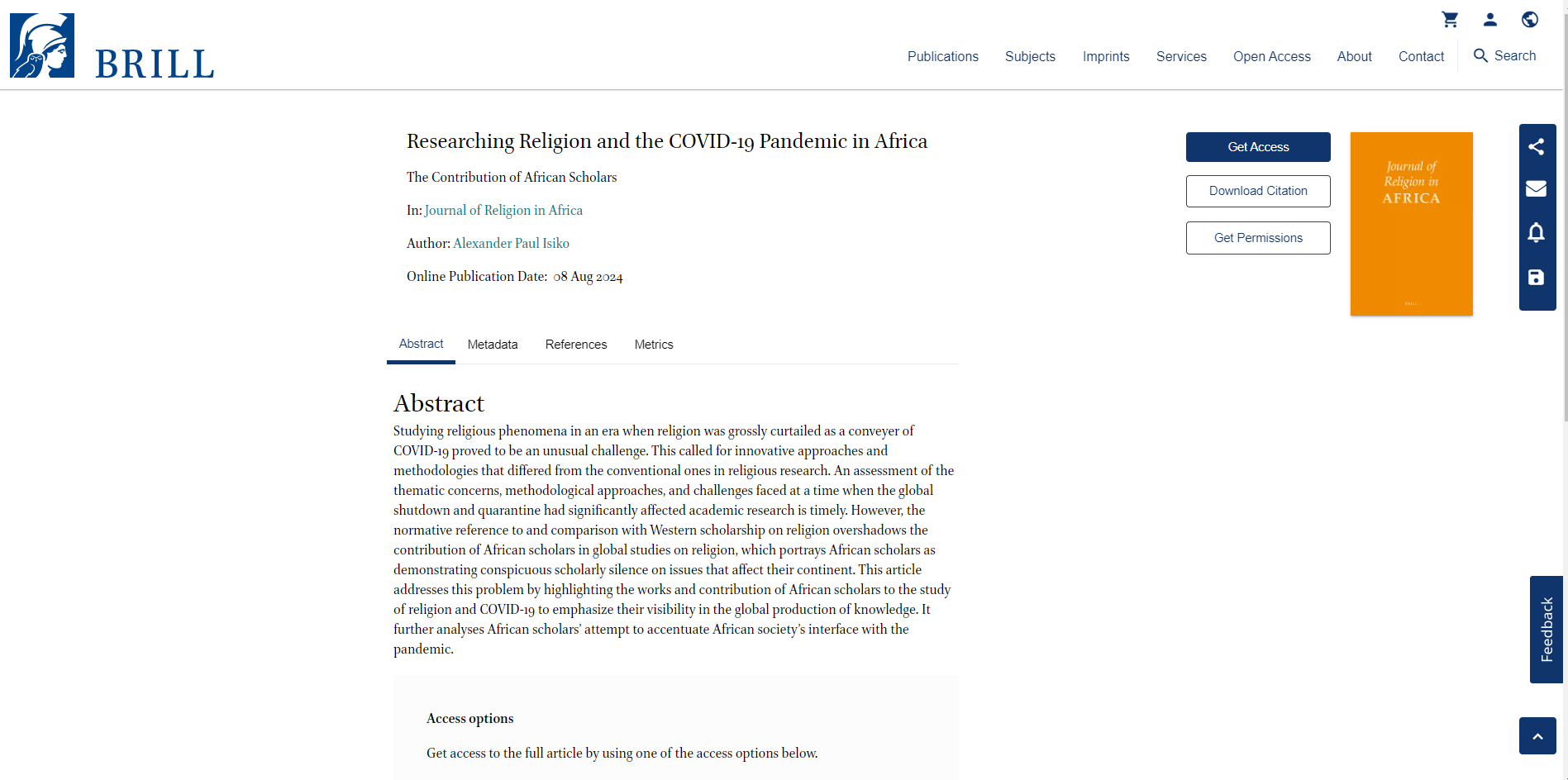 Isiko, A. P. (2024). Researching Religion and the COVID-19 Pandemic in Africa: The Contribution of African Scholars. Journal of Religion in Africa (published online ahead of print 2024). https://doi.org/10.1163/15700666-12340312