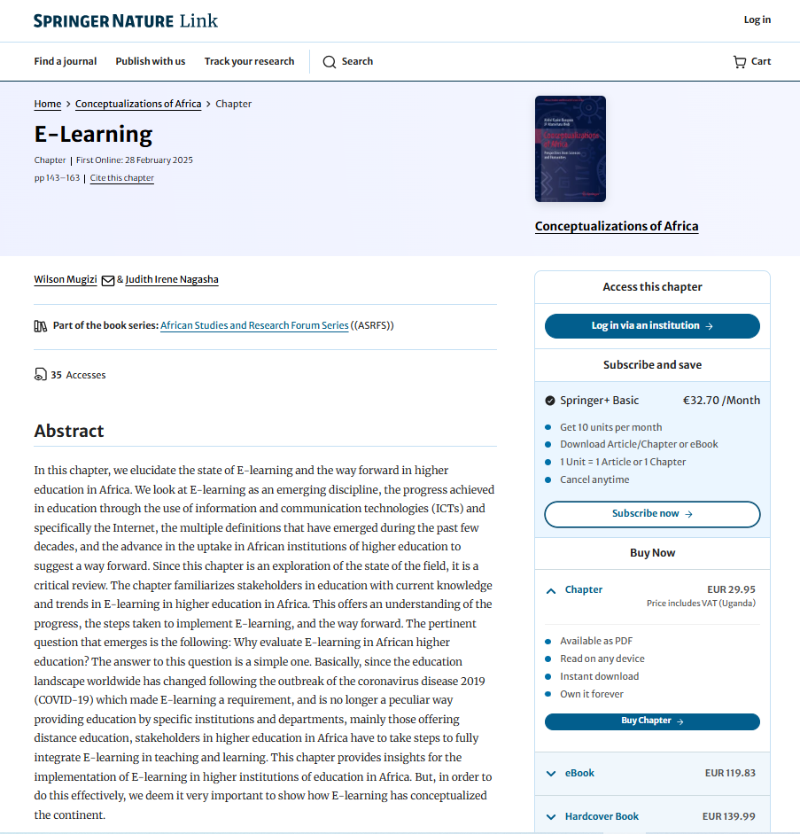 | dc.identifier.citation | Mugizi, W. & Nagasha, J. I. (2024). E-Learning. In: Bangura, A.K., Ifedi, J.A. (eds) Conceptualizations of Africa. African Studies and Research Forum Series. Springer, Cham. https://doi.org/10.1007/978-3-031-74535-5_9 | |