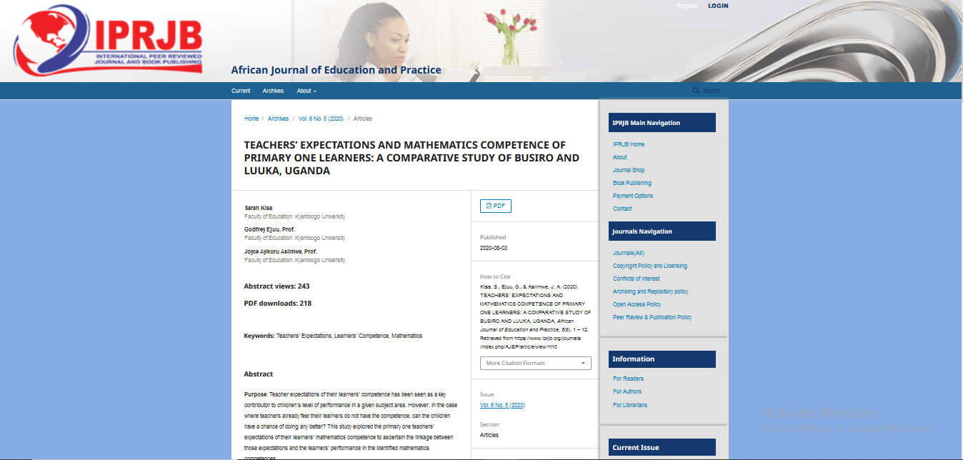 Kisa, S., Ejuu, G., & Asiimwe, J. A. (2020). Teachers’ expectations and mathematics competence of primary one learners: a comparative study of Busiro and Luuka, Uganda. African Journal of Education and Practice, 6(5), 1-12.