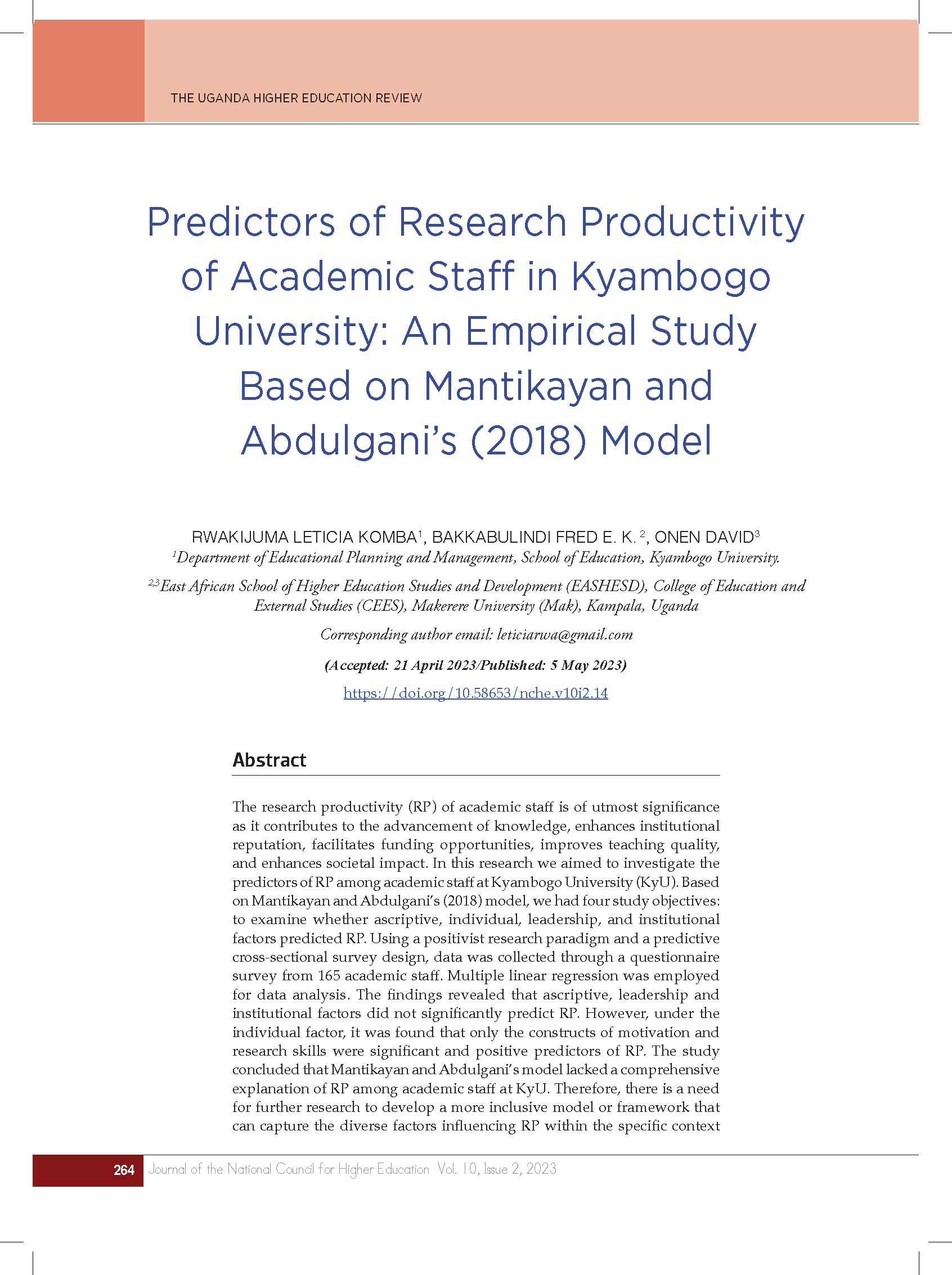 Predictors of research productivity of academic staff in Kyambogo University: an empirical study based on Mantikayan and Abdulgani’s (2018) Model