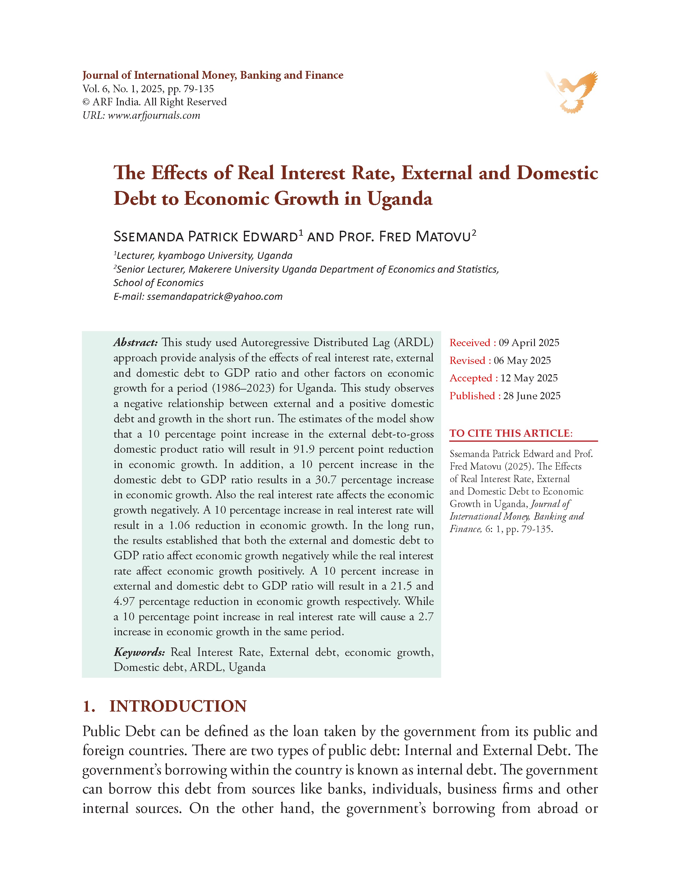 | dc.identifier.citation | Ssemanda Patrick Edward and Prof. Fred Matovu (2025). The Effects of Real Interest Rate, External and Domestic Debt to Economic Growth in Uganda, Journal of International Money, Banking and Finance, 6: 1, pp. 79-135. | |