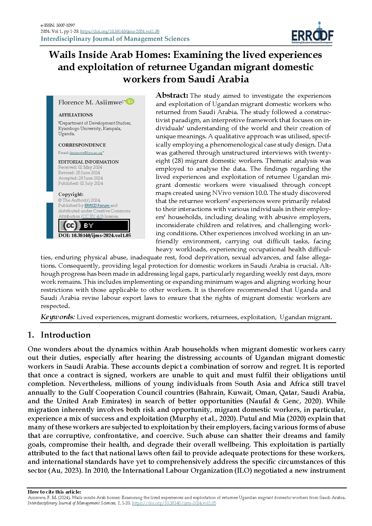 Asiimwe, F. M. (2024). Wails inside Arab homes: Examining the lived experiences and exploitation of returnee Ugandan migrant domestic workers from Saudi Arabia. Interdisciplinary Journal of Management Sciences, 1, 1-20. https://doi.org/10.38140/ijms-2024.vol1.05