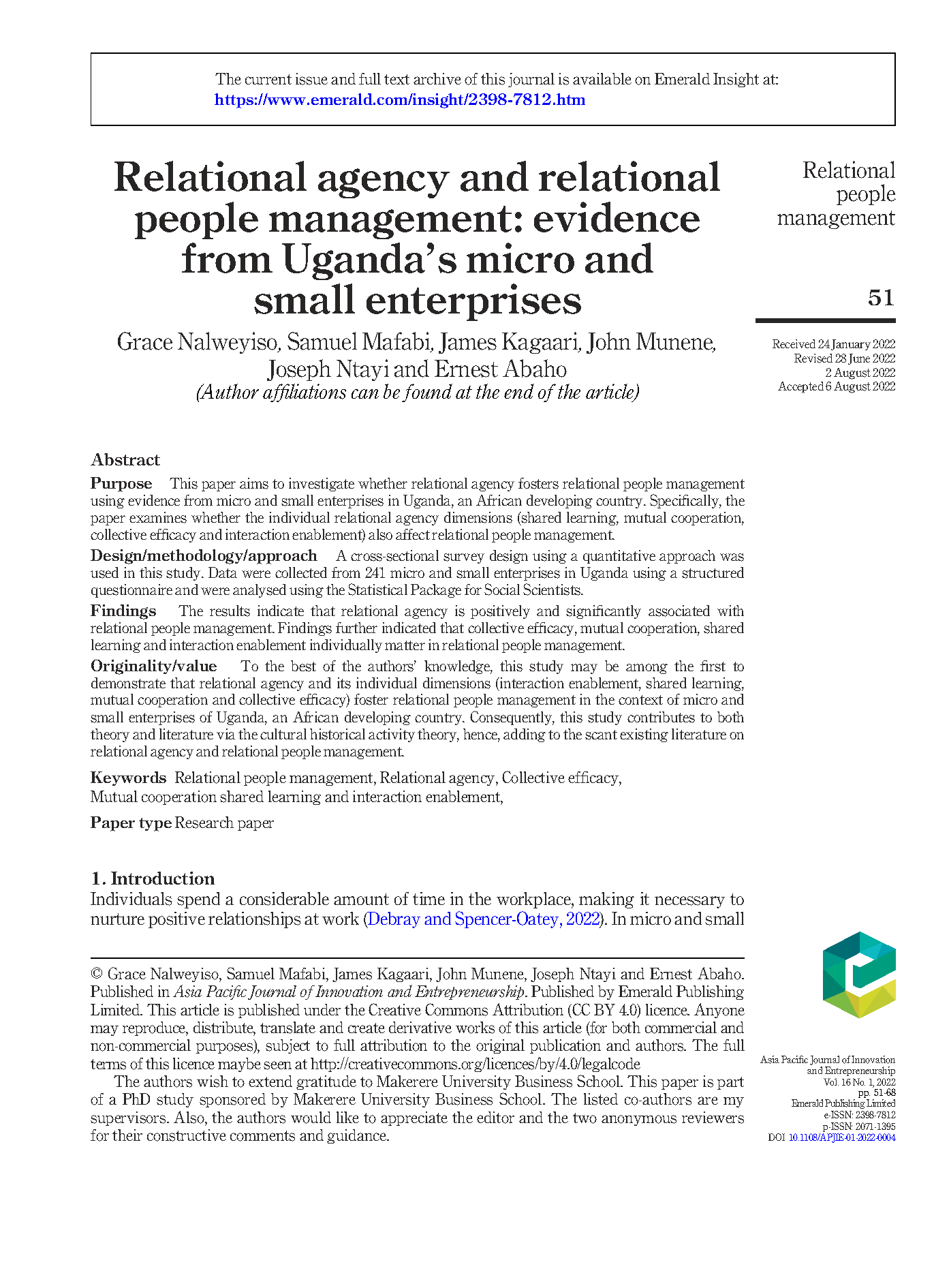 | dc.identifier.citation | Nalweyiso, G., Mafabi, S., Kagaari, J., Munene, J., Ntayi, J. and Abaho, E. (2022), "Relational agency and relational people management: evidence from Uganda’s micro and small enterprises", Asia Pacific Journal of Innovation and Entrepreneurship, Vol. 16 No. 1, pp. 51-68. https://doi.org/10.1108/APJIE-01-2022-0004 | en_US |