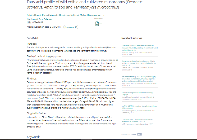 Ogwok, P., Muyinda, R., Nakisozi, H., & Bamuwamye, M. (2017). Fatty acid profile of wild edible and cultivated mushrooms (Pleurotus ostreatus, Amanita spp and Termitomyces microcarpus). Nutrition & Food Science, 47(3), 357-368.