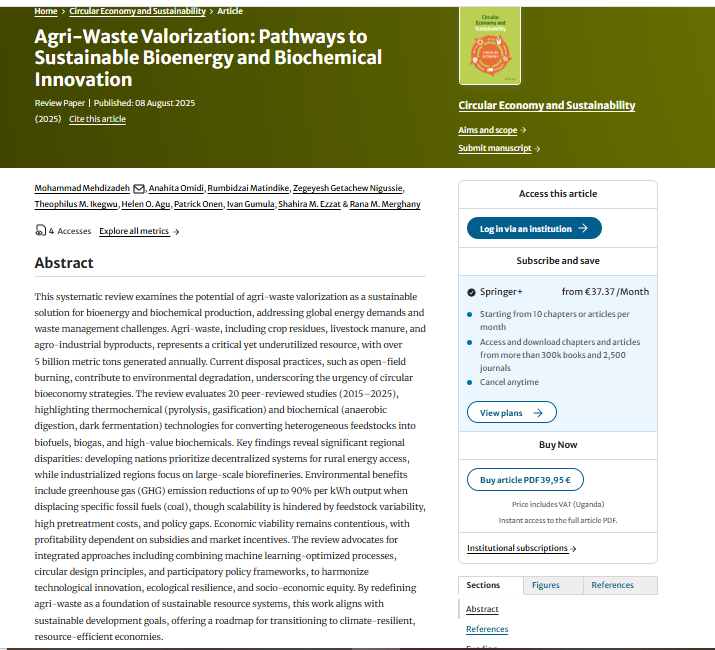 Mehdizadeh, M., Omidi, A., Matindike, R., Nigussie, Z. G., Ikegwu, T. M., Agu, H. O., ... & Merghany, R. M. (2025). Agri-Waste Valorization: Pathways to Sustainable Bioenergy and Biochemical Innovation. Circular Economy and Sustainability, 1-31.