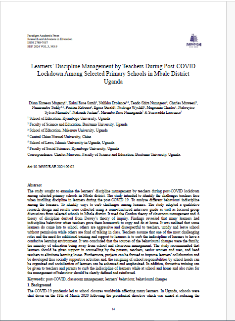Learners’ discipline management by teachers during post-covid lockdown among selected primary schools in mbale district Uganda