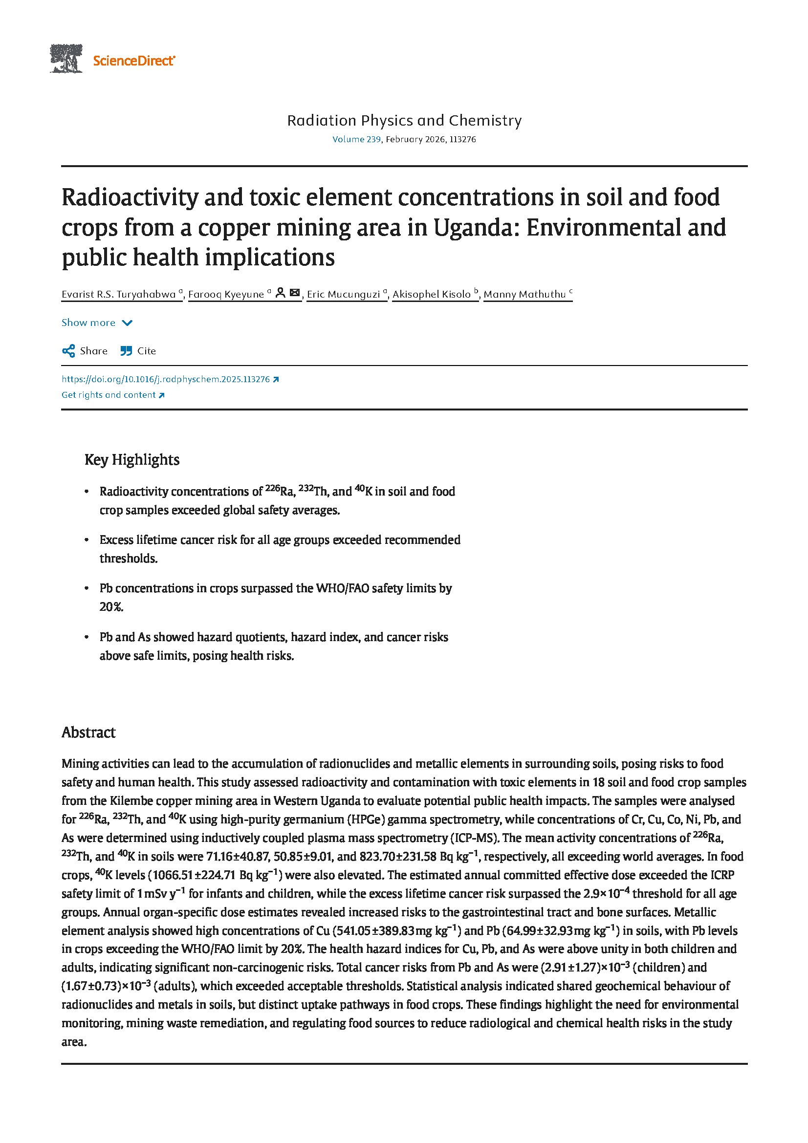 Turyahabwa, E. R., Kyeyune, F., Mucunguzi, E., Kisolo, A., & Mathuthu, M. (2025). Radioactivity and toxic element concentrations in soil and food crops from a copper mining area in Uganda: Environmental and public health implications. Radiation Physics and Chemistry, 113276.