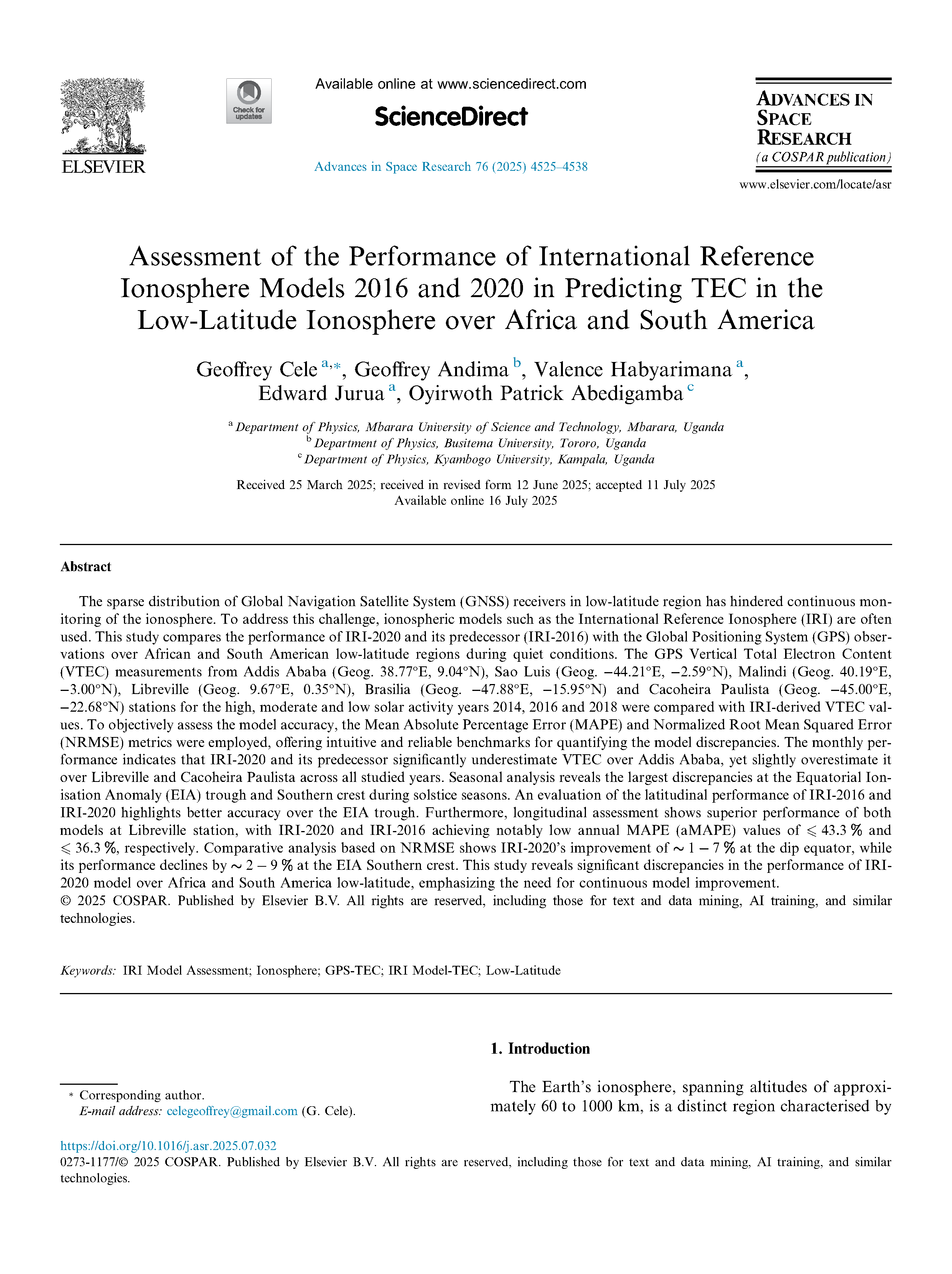 and , respectively. Comparative analysis based on NRMSE shows IRI-2020’s improvement of at the dip equator, while its performance declines by at the EIA Southern crest. This study reveals significant discrepancies in the performance of IRI-2020 model over Africa and South America low-latitude, emphasizing the need for continuous model improvement.