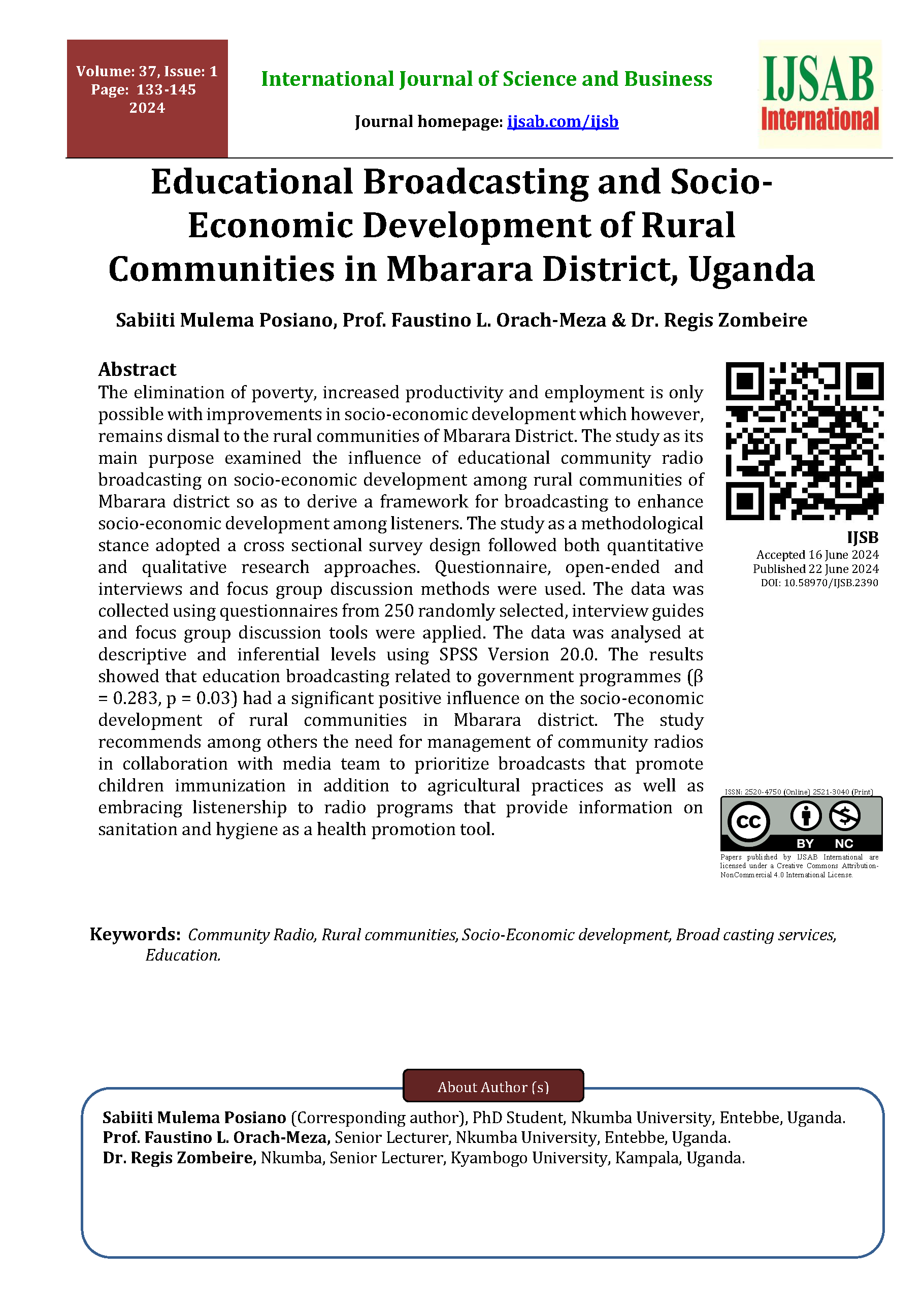 Posiano, S. M., Orach-Meza, F. L., & Zombeire, R. (2024). Educational Broadcasting and Socio-Economic Development of Rural Communities in Mbarara District, Uganda. International Journal of Science and Business, 37(1), 133-145.