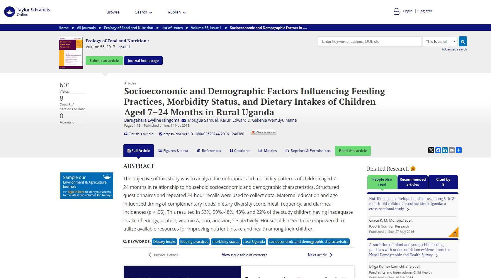 Isingoma, B. E., Samuel, M., Edward, K., & Maina, G. W. (2016). Socioeconomic and Demographic Factors Influencing Feeding Practices, Morbidity Status, and Dietary Intakes of Children Aged 7–24 Months in Rural Uganda. Ecology of Food and Nutrition, 56(1), 1–16.