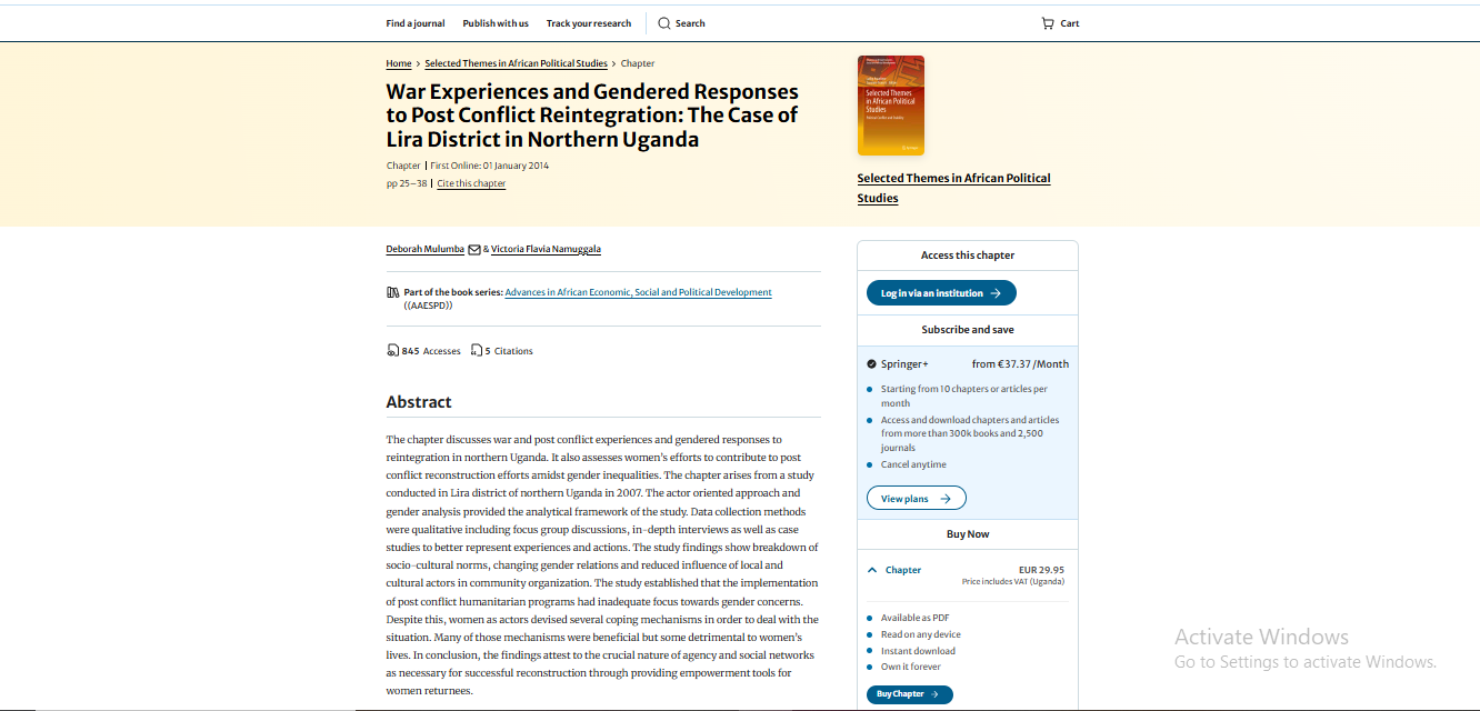 Mulumba, D., & Namuggala, V. F. (2014). War experiences and gendered responses to post conflict reintegration: The case of Lira district in northern Uganda. In Selected themes in African political studies: Political conflict and stability (pp. 25-38). Cham: Springer International Publishing.