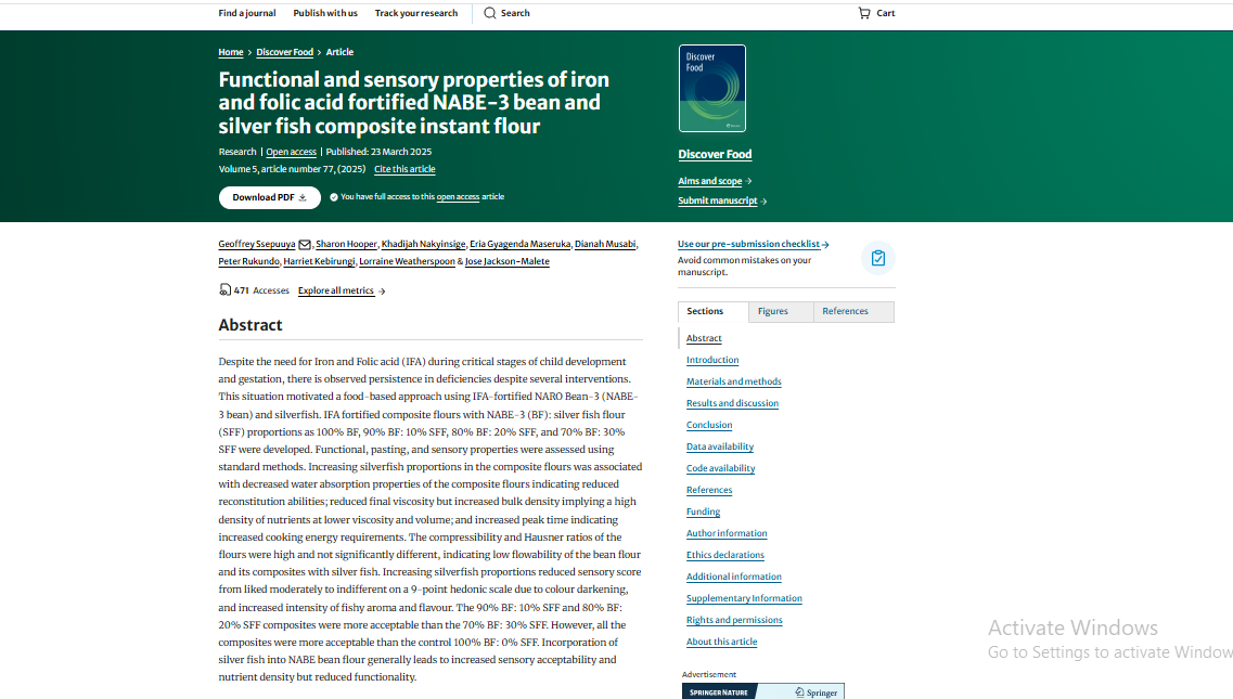 Ssepuuya, G., Hooper, S., Nakyinsige, K., Maseruka, E. G., Musabi, D., Rukundo, P., ... & Jackson-Malete, J. Sensory and Functional Properties of Iron and Folic Acid Fortified NABE-3 Bean and Silver Fish Composite Instant Flour. Available at SSRN 4561369.