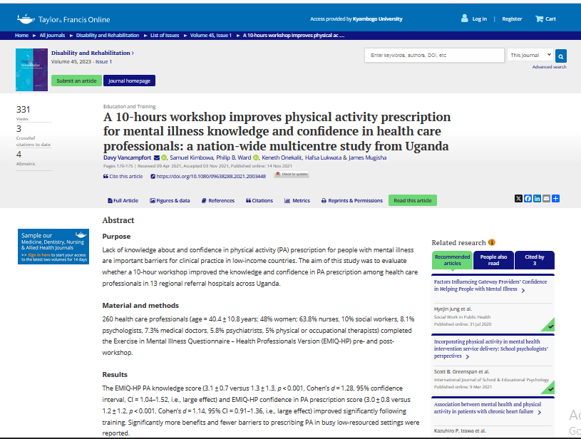Vancampfort, D., Kimbowa, S., Ward, P. B., Onekalit, K., Lukwata, H., & Mugisha, J. (2023). A 10-hours workshop improves physical activity prescription for mental illness knowledge and confidence in health care professionals: a nation-wide multicentre study from Uganda. Disability and Rehabilitation, 45(1), 170-175.