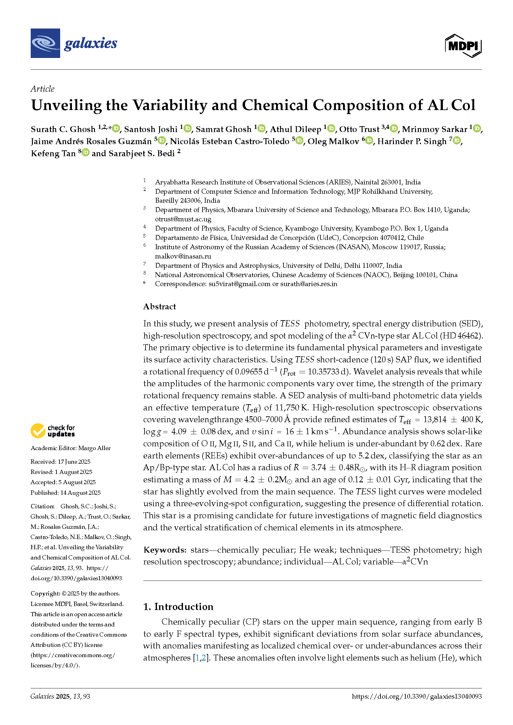 Ghosh, S. C., Joshi, S., Ghosh, S., Dileep, A., Trust, O., Sarkar, M., ... & Bedi, S. S. (2025). Unveiling the Variability and Chemical Composition of AL Col. Galaxies.