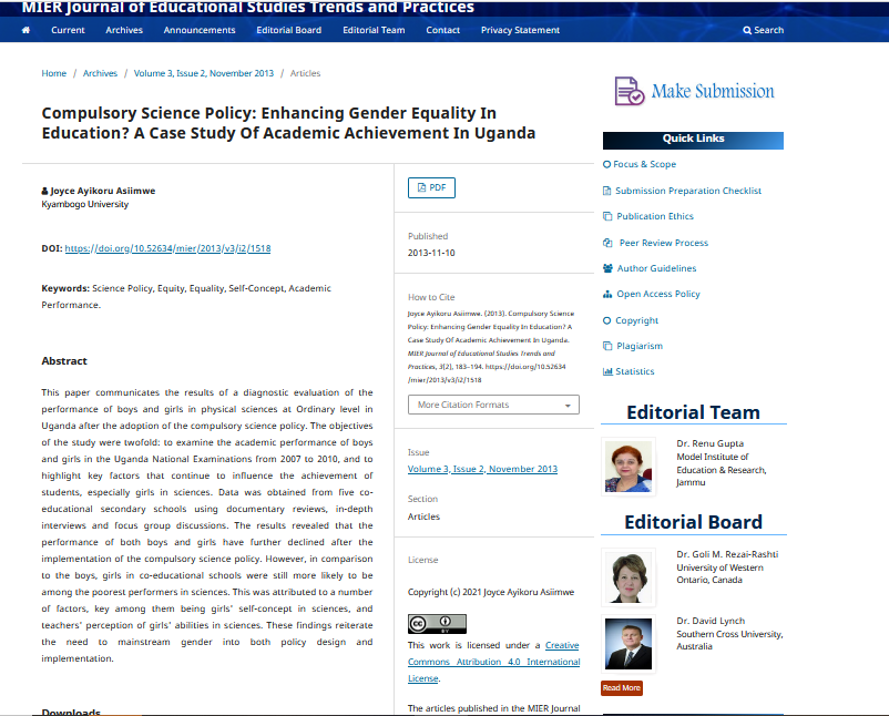 Asiimwe, J. A. (2013). Compulsory science policy: enhancing gender equality in education? A case study of academic achievement in Uganda. MIER Journal of Educational Studies Trends and Practices, 183-194.