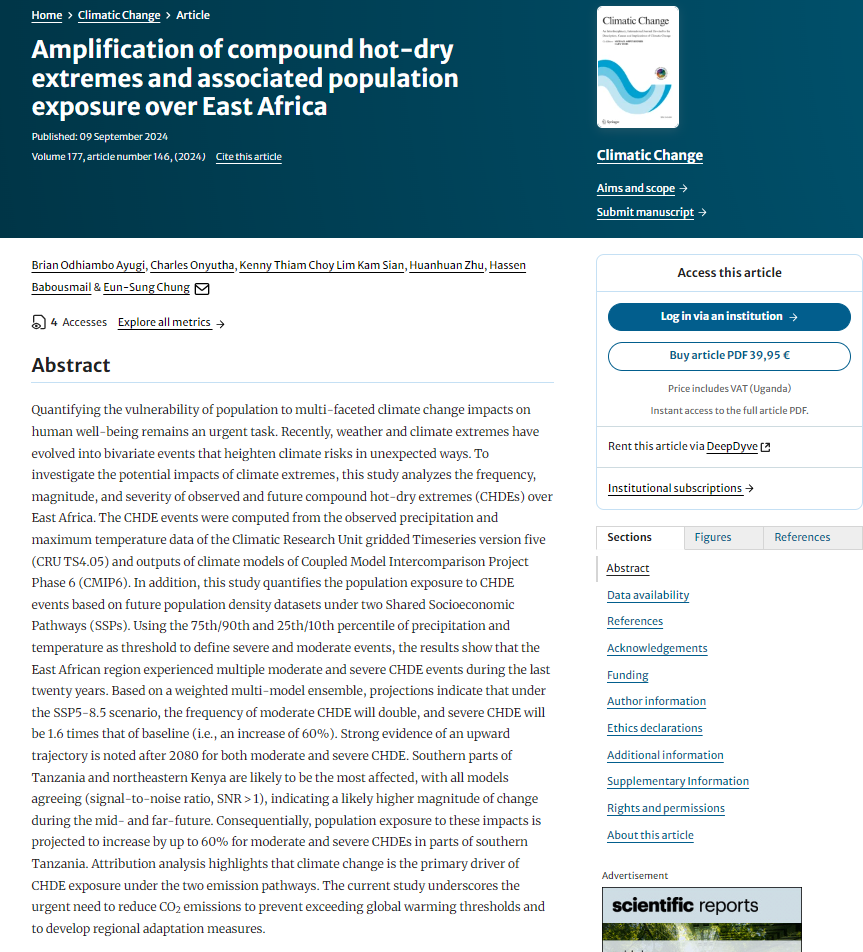Ayugi, B. O., Onyutha, C., Sian, K. T. C. L. K., Zhu, H., Babousmail, H. & Chung, E. (2024). Amplification of compound hot-dry extremes and associated population exposure over East Africa. Climatic Change 177, 146 (2024). https://doi.org/10.1007/s10584-024-03802-6