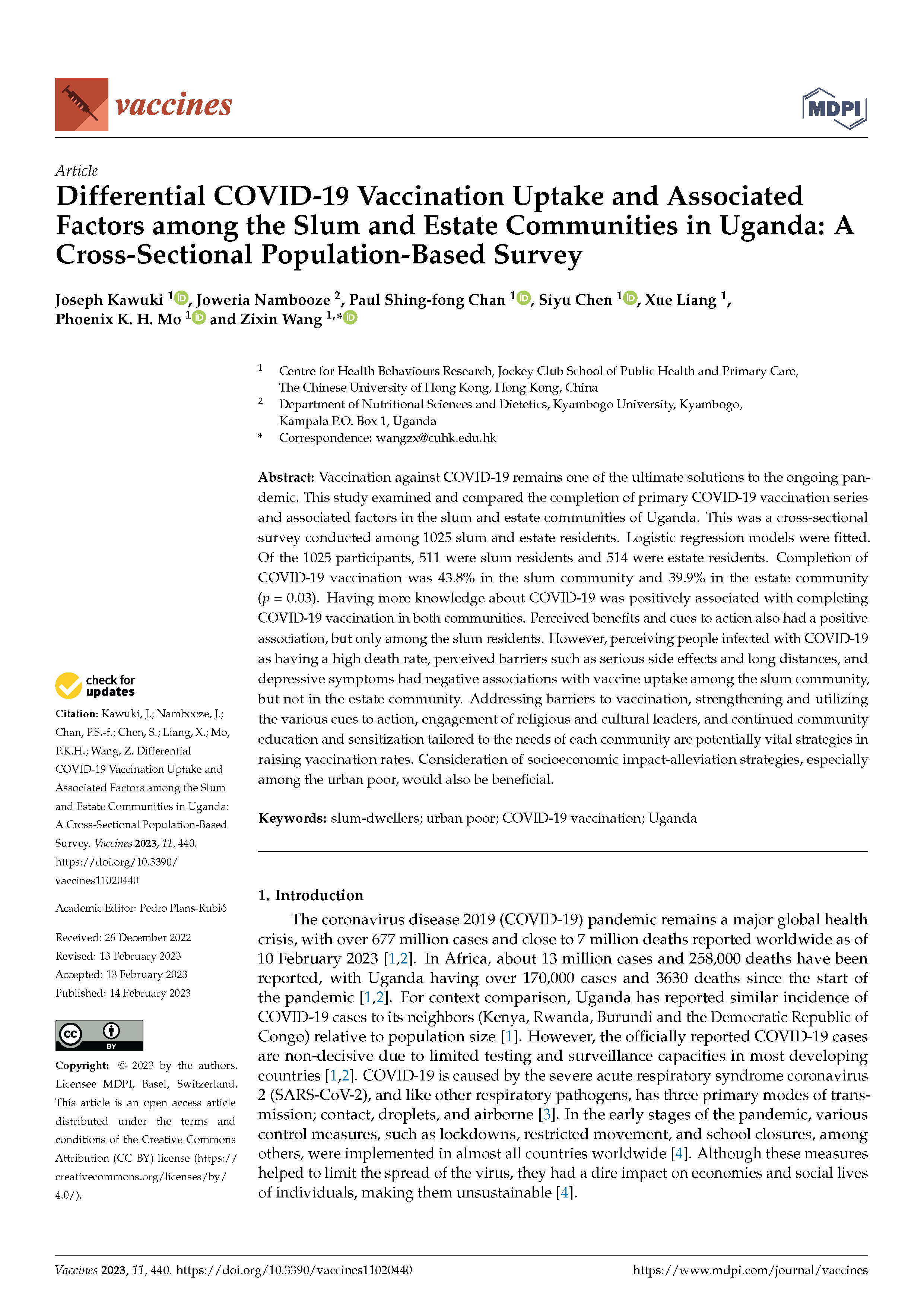Kawuki, J., Nambooze, J., Chan, P. S. F., Chen, S., Liang, X., Mo, P. K., & Wang, Z. (2023). Differential COVID-19 Vaccination Uptake and Associated Factors among the Slum and Estate Communities in Uganda: A Cross-Sectional Population-Based Survey. Vaccines, 11(2), 440.