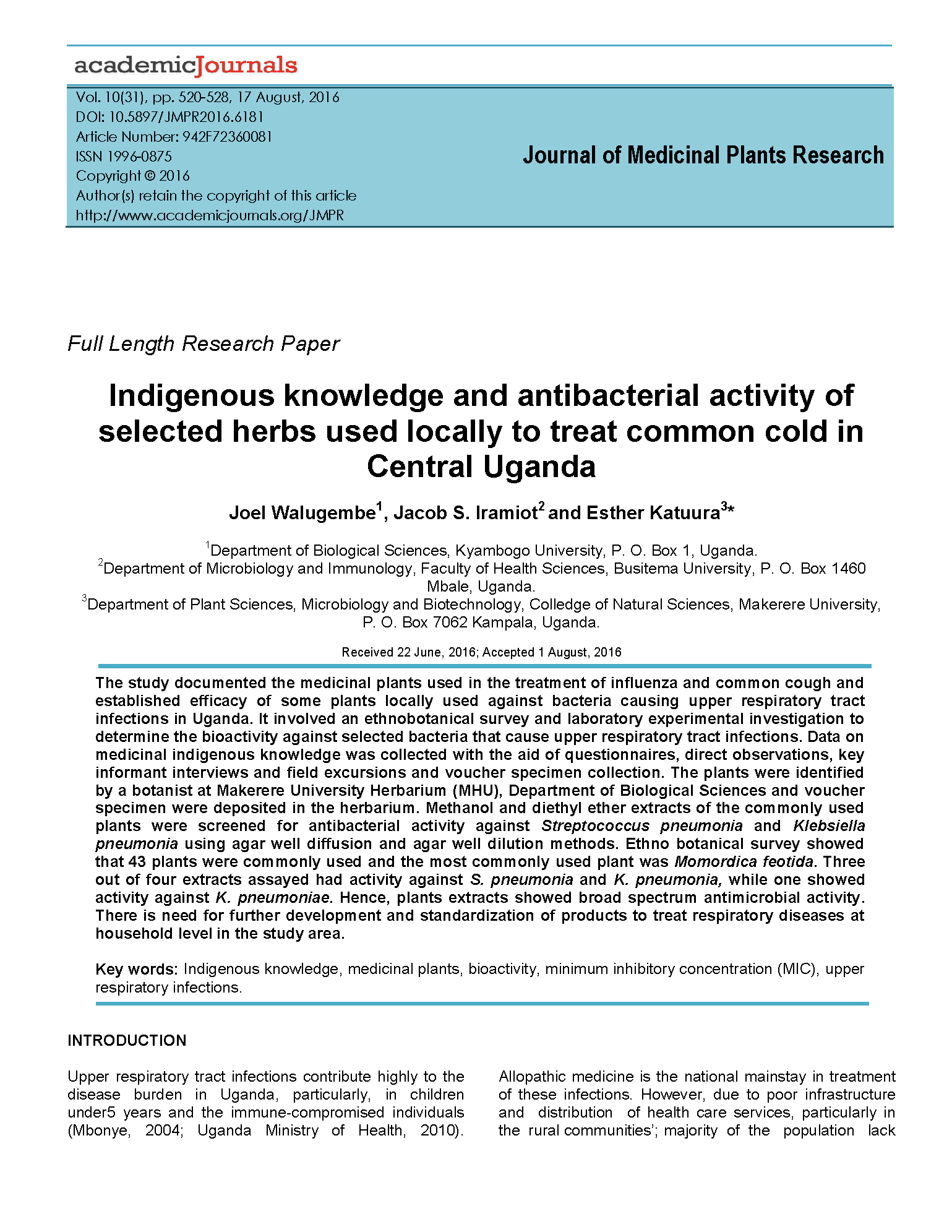 Walugembe, J., Iramiot, J. S. & Katuura, E. (2016) Indigenous knowledge and antibacterial activity of selected herbs used locally to treat common cold in Central Uganda.