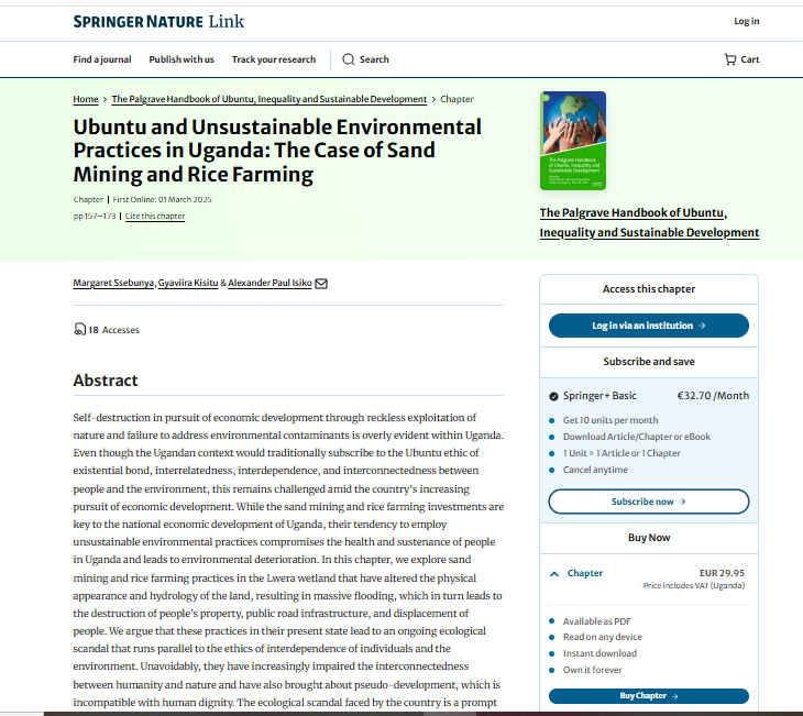 Ssebunya, M., Kisitu, G., & Isiko, A. P. (2025). Ubuntu and unsustainable environmental practices in Uganda: the case of sand mining and rice farming. In The Palgrave Handbook of Ubuntu, Inequality and Sustainable Development (pp. 157-173). Cham: Springer Nature Switzerland.