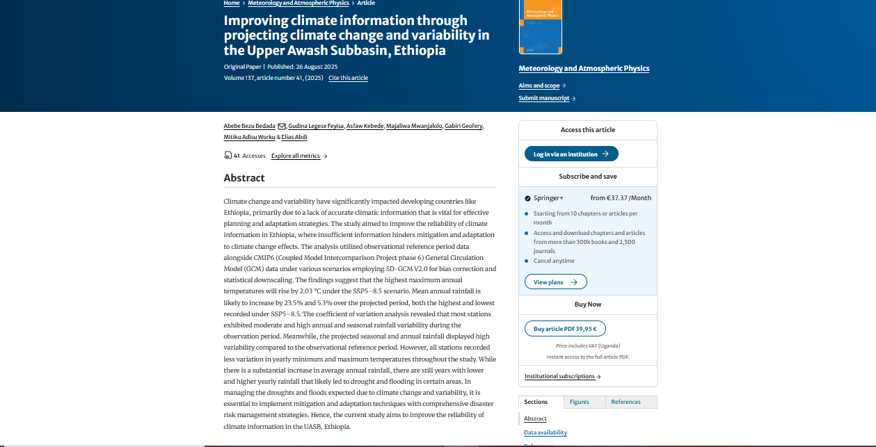 Bedada, A. B., Feyisa, G. L., Kebede, A., Mwanjalolo, M., Geofery, G., Worku, M. A., & Abdi, E. (2025). Improving climate information through projecting climate change and variability in the Upper Awash Subbasin, Ethiopia. Meteorology and Atmospheric Physics, 137(5), 41.