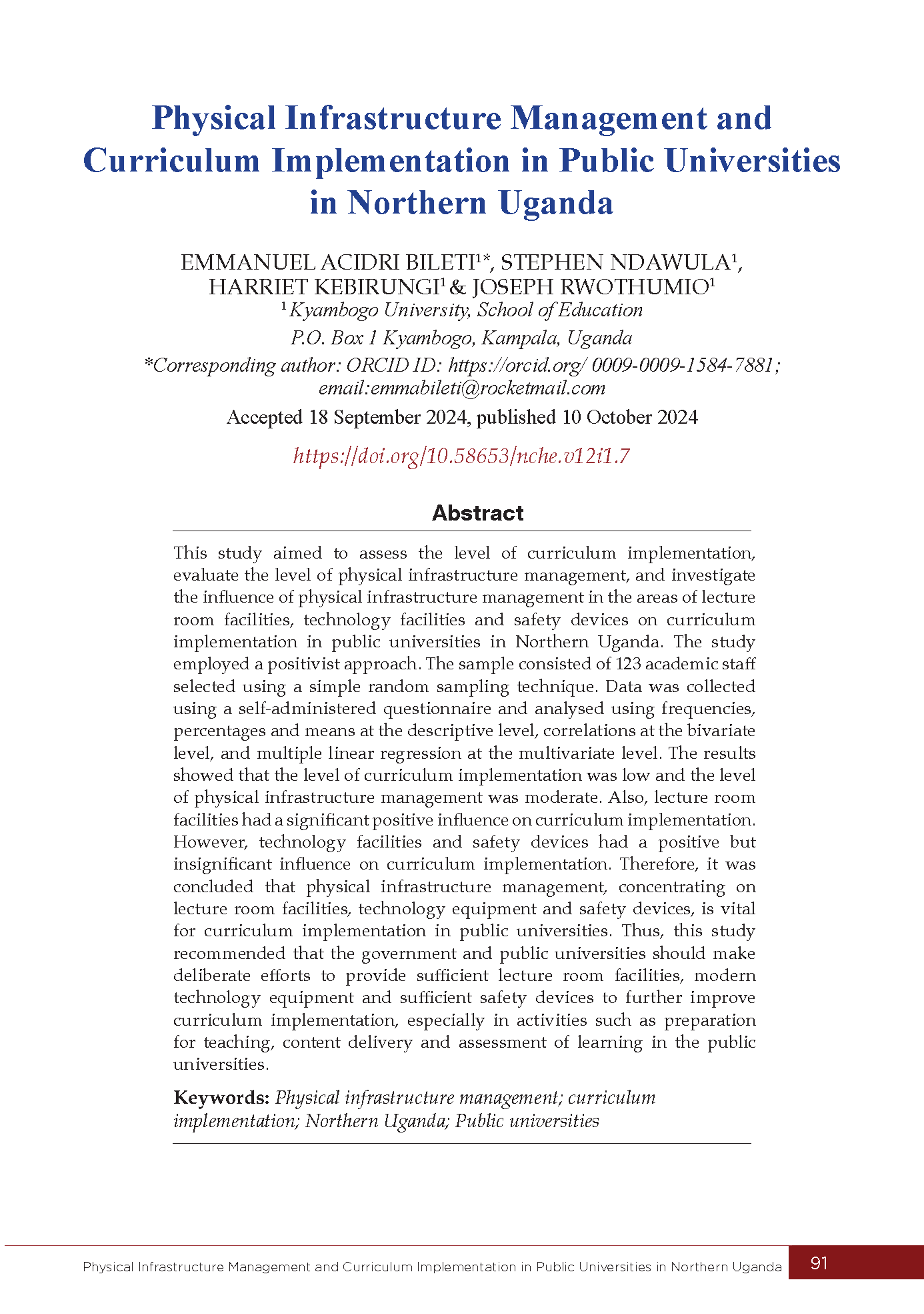 Physical infrastructure management and curriculum implementation in public universities in northern Uganda