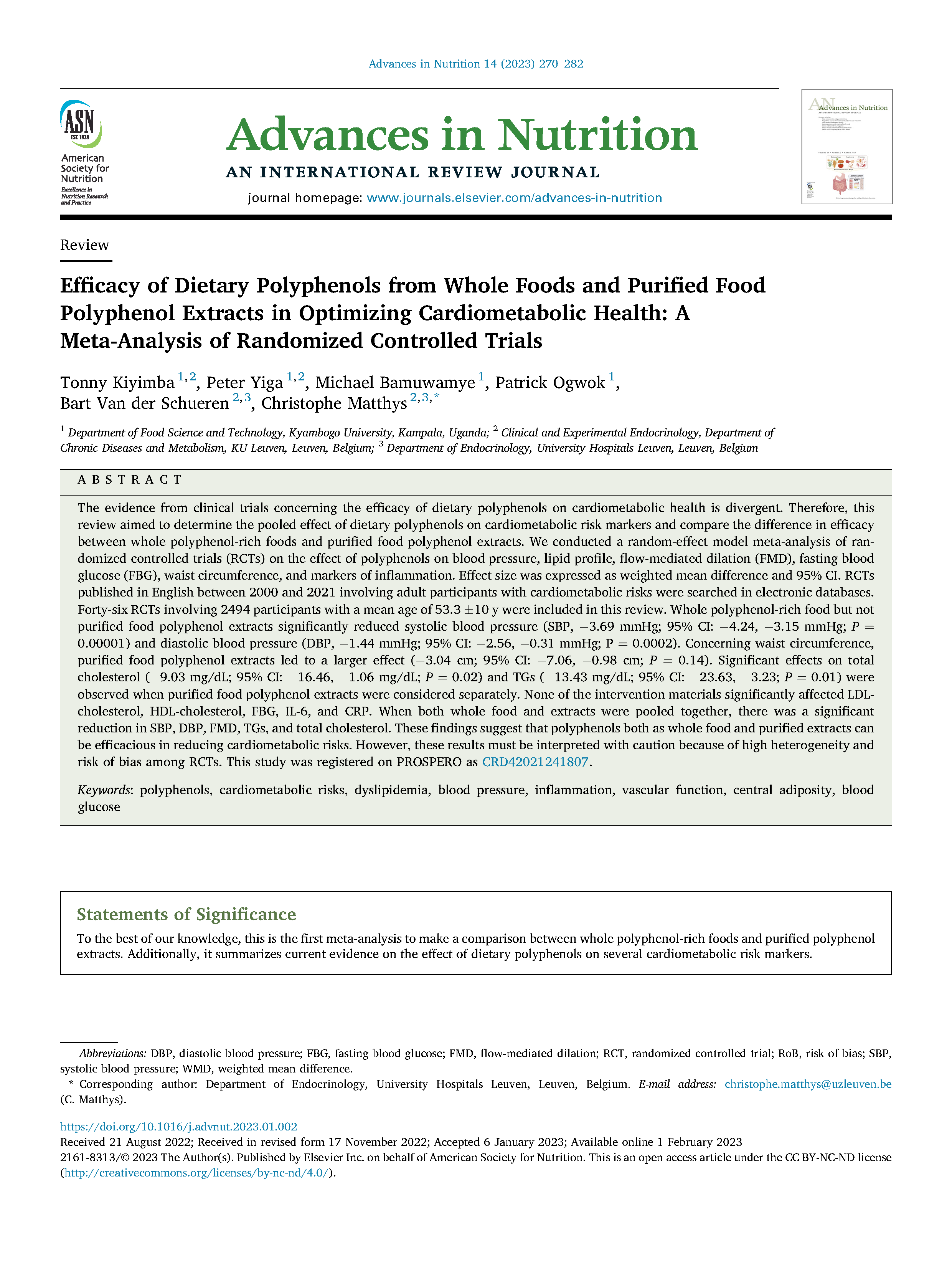 Kiyimba, T., Yiga, P., Bamuwamye, M., Ogwok, P., Van der Schueren, B., & Matthys, C. (2023). Efficacy of Dietary Polyphenols from Whole Foods and Purified Food Polyphenol Extracts in Optimizing Cardiometabolic Health: A meta-analysis of randomized-controlled trials. Advances in Nutrition.