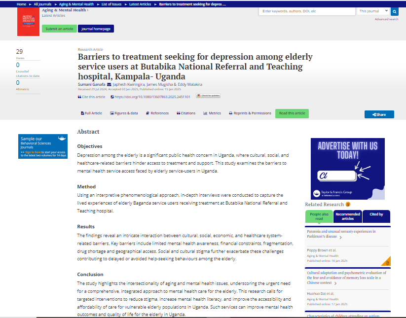 Ganafa, S., Kwiringira, J., Mugisha, J., & Walakira, E. (2025). Barriers to treatment seeking for depression among elderly service users at Butabika National Referral and Teaching hospital, Kampala-Uganda. Aging & Mental Health, 1-11.