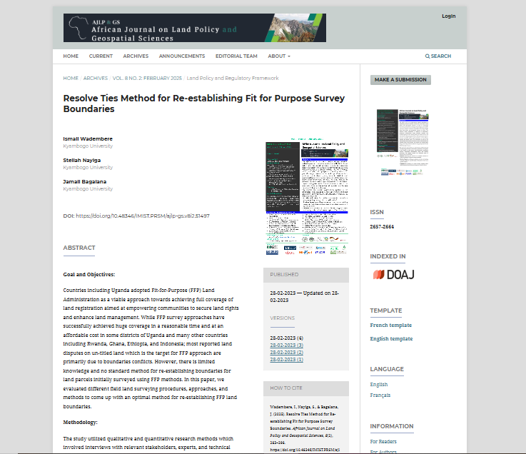 Wadembere, I. (2025). Resolve ties method for re-establishing fit for purpose survey boundaries. African Journal on Land Policy and Geospatial Sciences, 8(2).