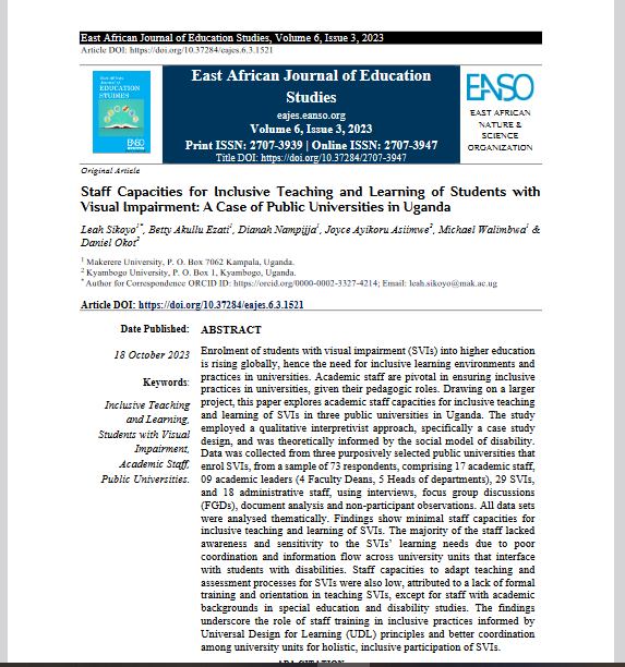 Sikoyo, L., Ezati, B. A., Nampijja, D., Asiimwe, J. A., Walimbwa, M., & Okot, D. (2023). Staff Capacities for Inclusive Teaching and Learning of Students with Visual Impairment: A Case of Public Universities in Uganda. East African Journal of Education Studies, 6(3), 174-191.