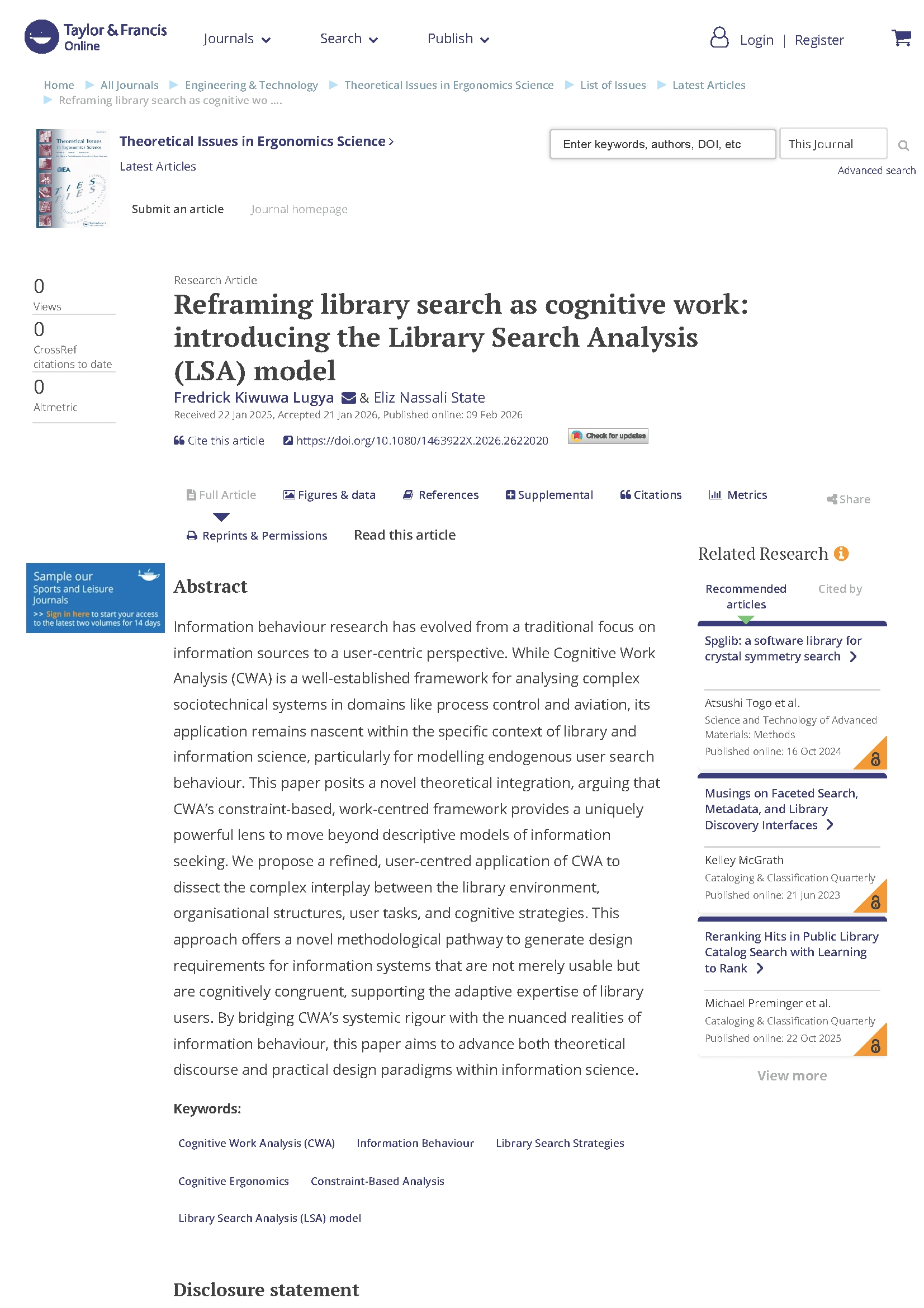 Lugya, F. K., & State, E. N. (2026). Reframing library search as cognitive work: introducing the Library Search Analysis (LSA) model. Theoretical Issues in Ergonomics Science, 1–9. https://doi.org/10.1080/1463922X.2026.2622020