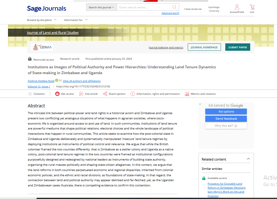 Kisekka-Ntale, F. (2024). Institutions as Images of Political Authority and Power Hierarchies: Understanding Land Tenure Dynamics of State-making in Zimbabwe and Uganda. Journal of Land and Rural Studies, 12(1), 92-115.