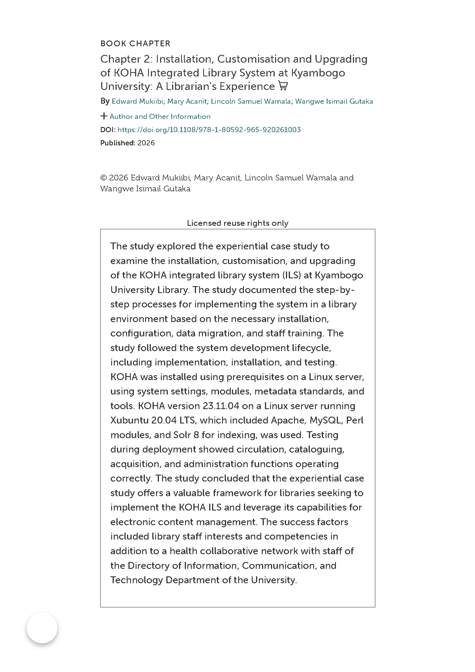 Mukiibi, E., Acanit, M., Wamala, L. S., & Gutaka, W. I. (2026). Installation, Customisation and Upgrading of KOHA Integrated Library System at Kyambogo University: A Librarian's Experience. Emerald Publishing Limited v1 DOI: https://doi.org/10.1108/978-1-80592-965-9