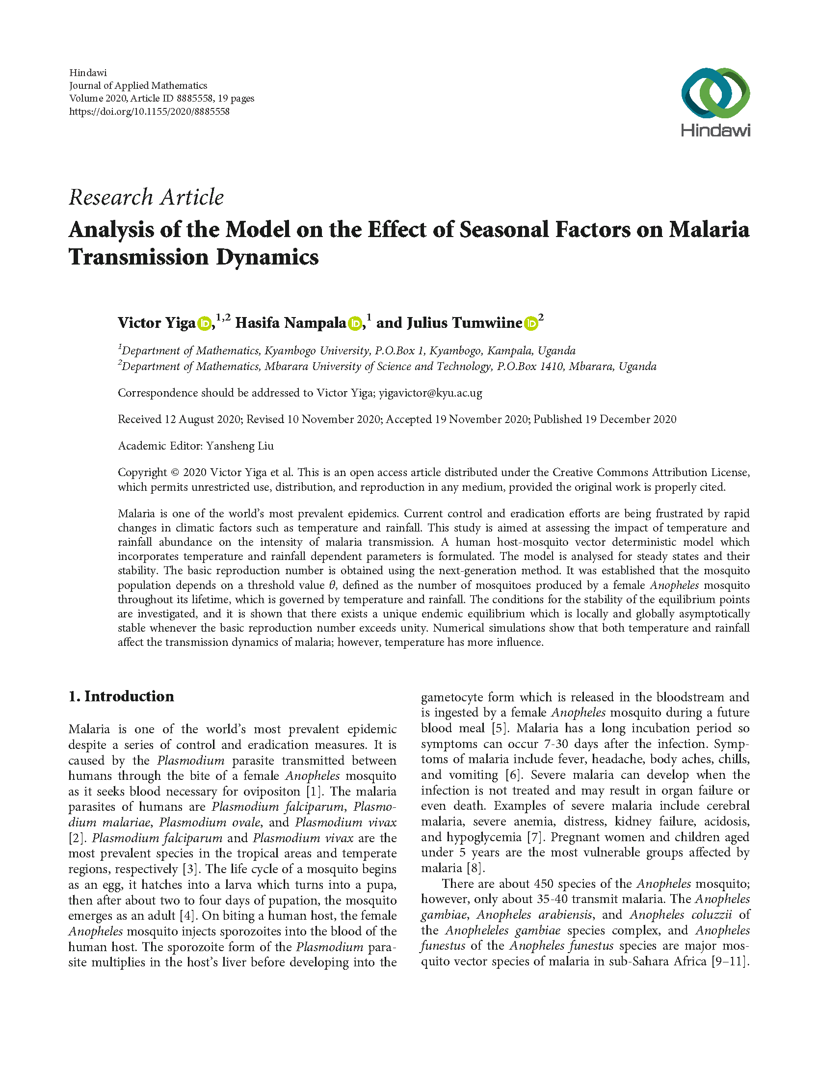 Yiga, V., Nampala, H., & Tumwiine, J. (2020). Analysis of the model on the effect of seasonal factors on malaria transmission dynamics. Journal of Applied Mathematics, 2020, 1-19.