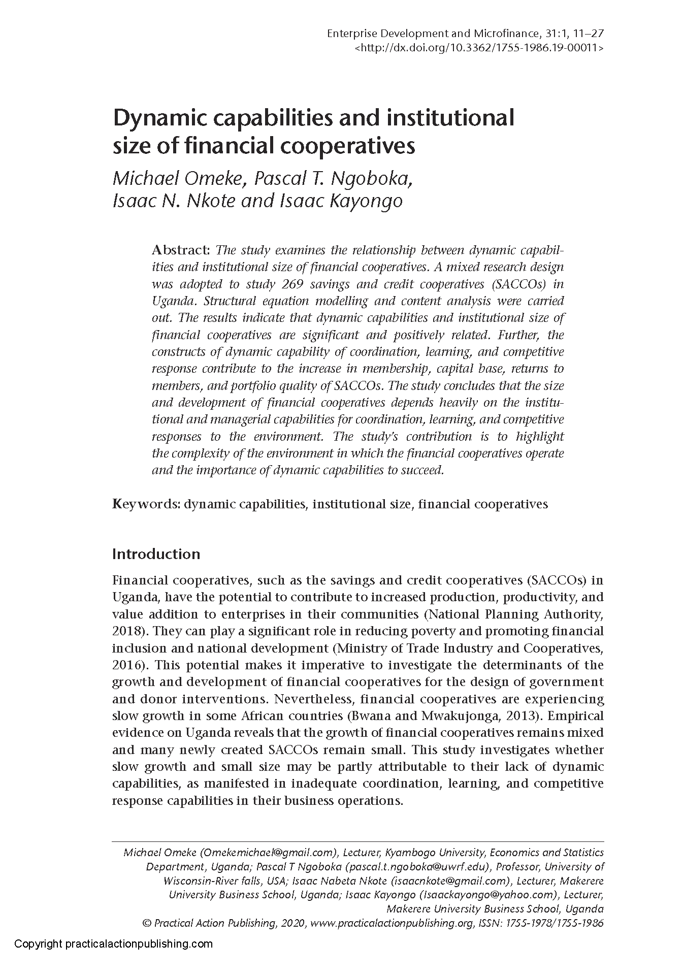 Omeke, M., Ngoboka, P. T., Nkote, I. N., & Kayongo, I. (2020). Dynamic capabilities and institutional size of financial cooperatives.