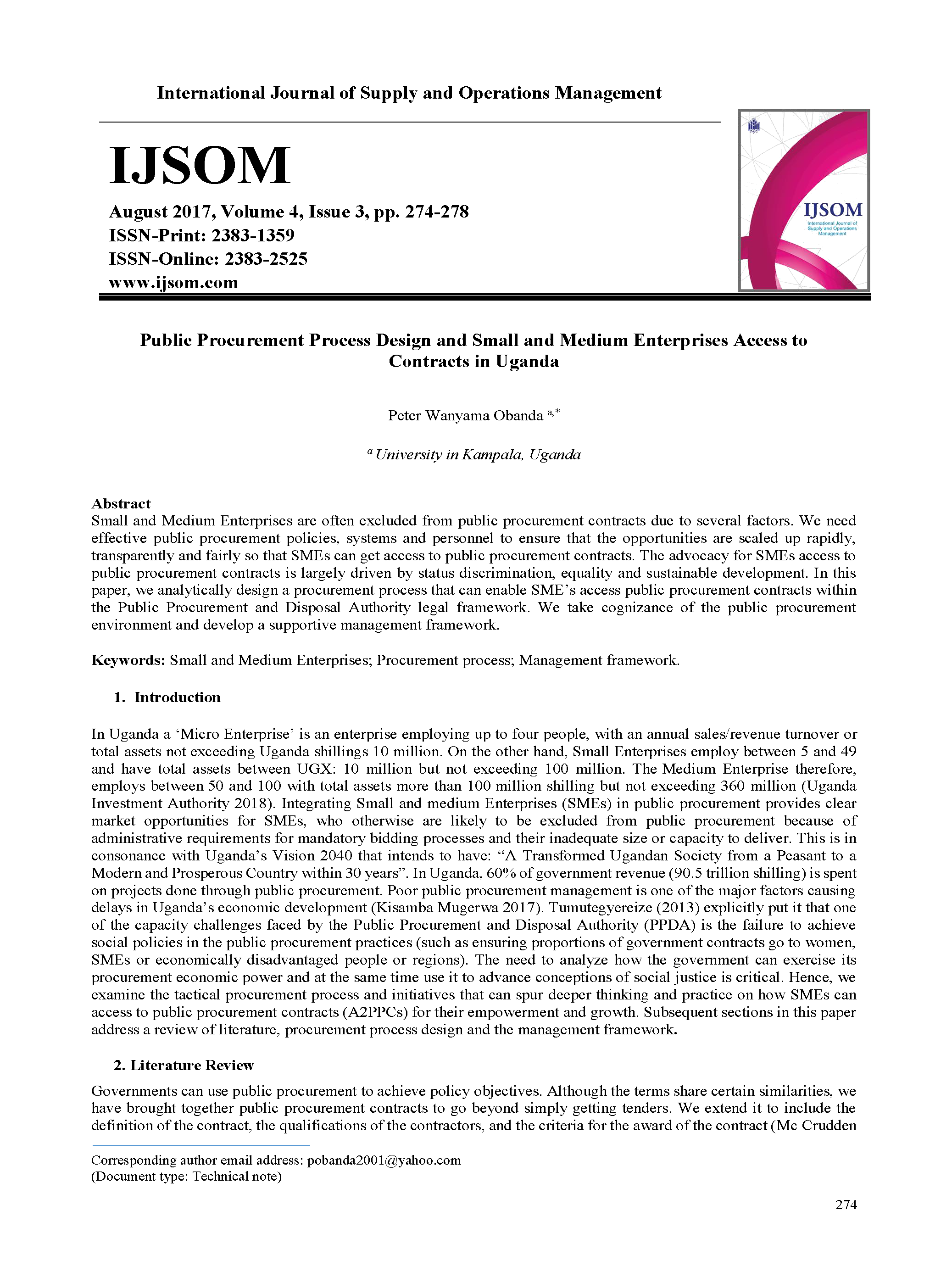 Obanda, P. W. (2017) Public Procurement Process Design and Small and Medium Enterprises Access to Contracts in Uganda