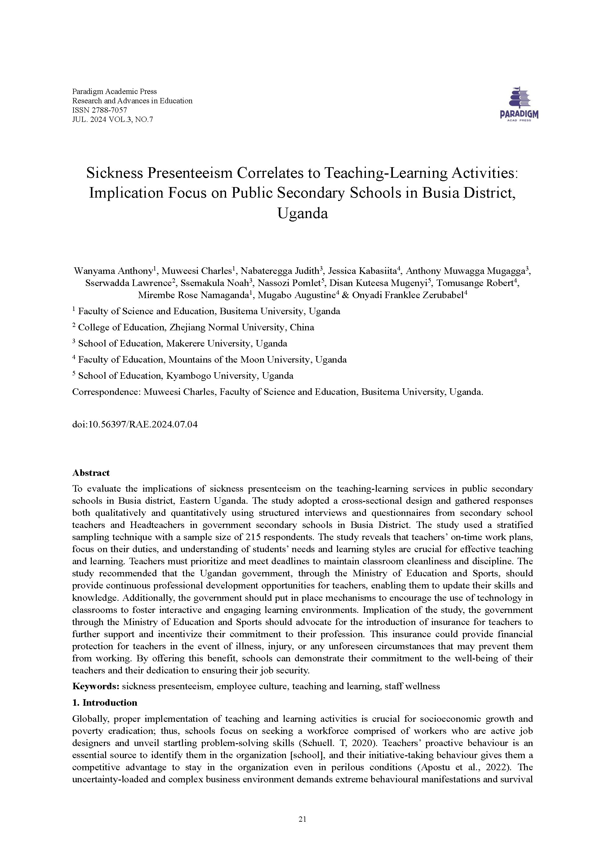 Anthony, W., Charles, M., Judith, N., Kabasiita, J., Mugagga, A. M., Lawrence, S., ... & Zerubabel, O. F. (2024). Sickness Presenteeism Correlates to Teaching-Learning Activities: Implication Focus on Public Secondary Schools in Busia District, Uganda. Research and Advances in Education, 3(7), 21-33.