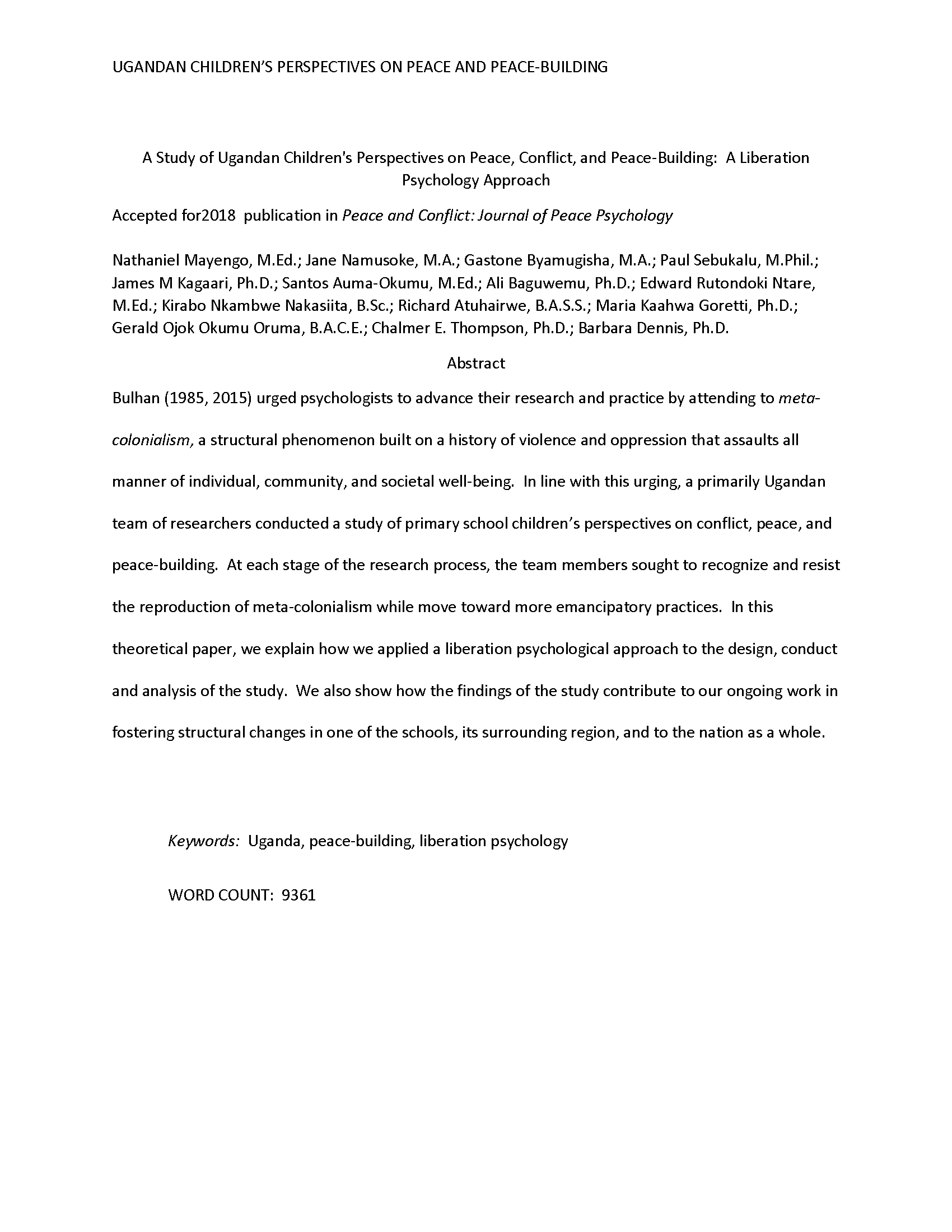Mayengo, N., Namusoke, J., Byamugisha, G., Sebukalu, P., Kagaari, J., Auma-Okumu, S., ... & Dennis, B. (2018). A study of Ugandan children’s perspectives on peace, conflict, and peace-building: A liberation psychology approach. Peace and Conflict: Journal of Peace Psychology, 24(3), 354.