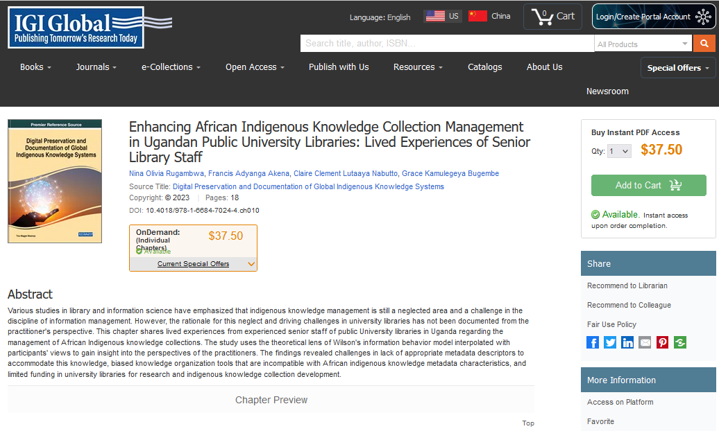 Rugambwa, N. O., Akena, F. A., Nabutto, C. C. L., & Bugembe, G. K. (2023). Enhancing African Indigenous Knowledge Collection Management in Ugandan Public University Libraries: Lived Experiences of Senior Library Staff. In Digital Preservation and Documentation of Global Indigenous Knowledge Systems (pp. 178-195). IGI Global.