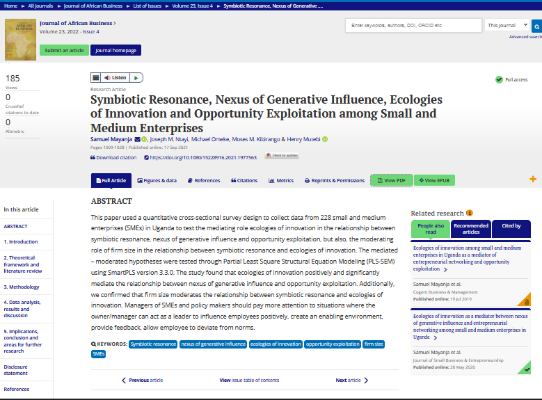 Mayanja, S., Ntayi, J. M., Omeke, M., Kibirango, M. M., & Mutebi, H. (2022). Symbiotic Resonance, Nexus of Generative Influence, Ecologies of Innovation and Opportunity Exploitation among Small and Medium Enterprises. Journal of African Business, 23(4), 1009-1028.