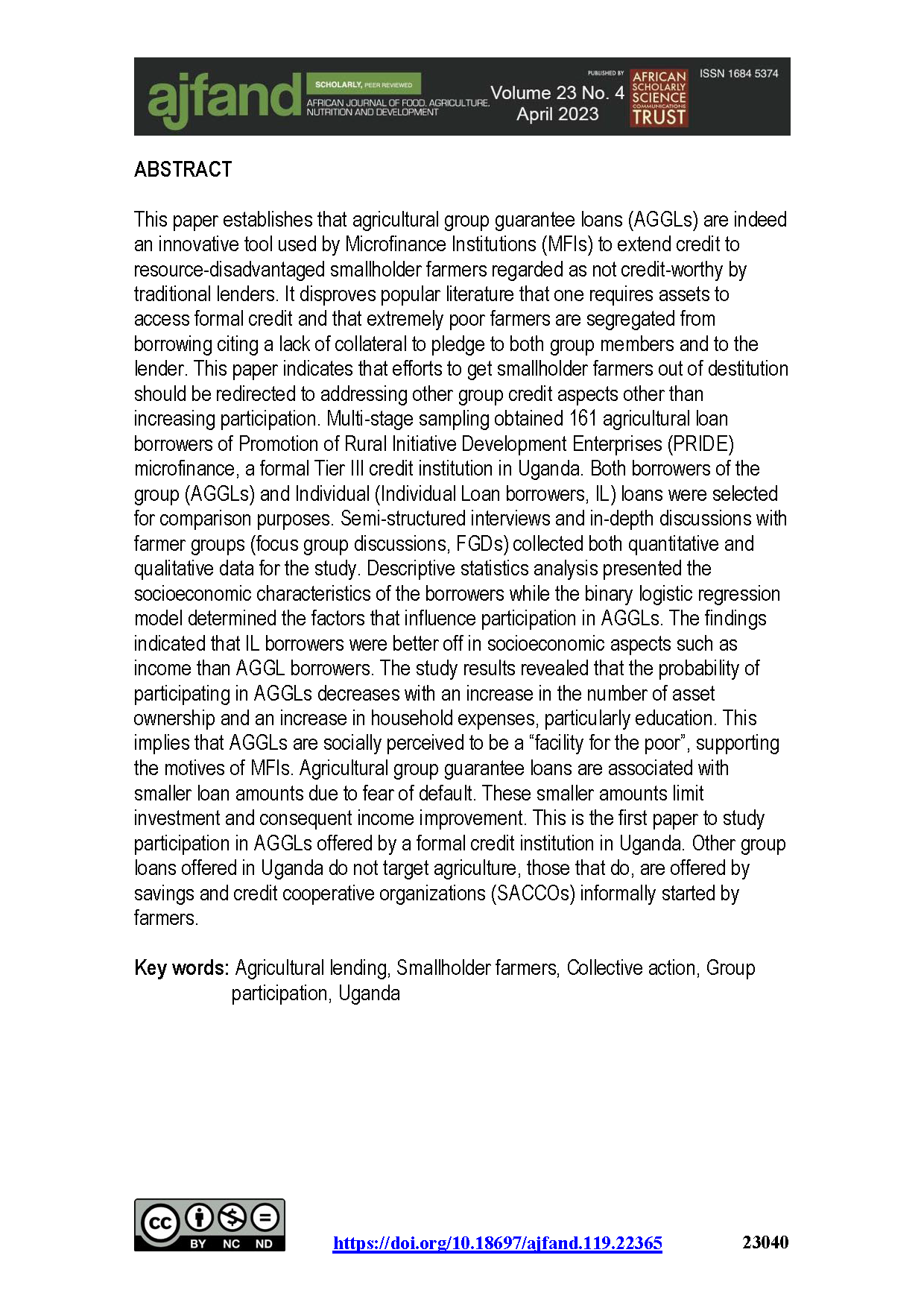 Agricultural lending, Smallholder farmers, Collective action, Group participation, Uganda