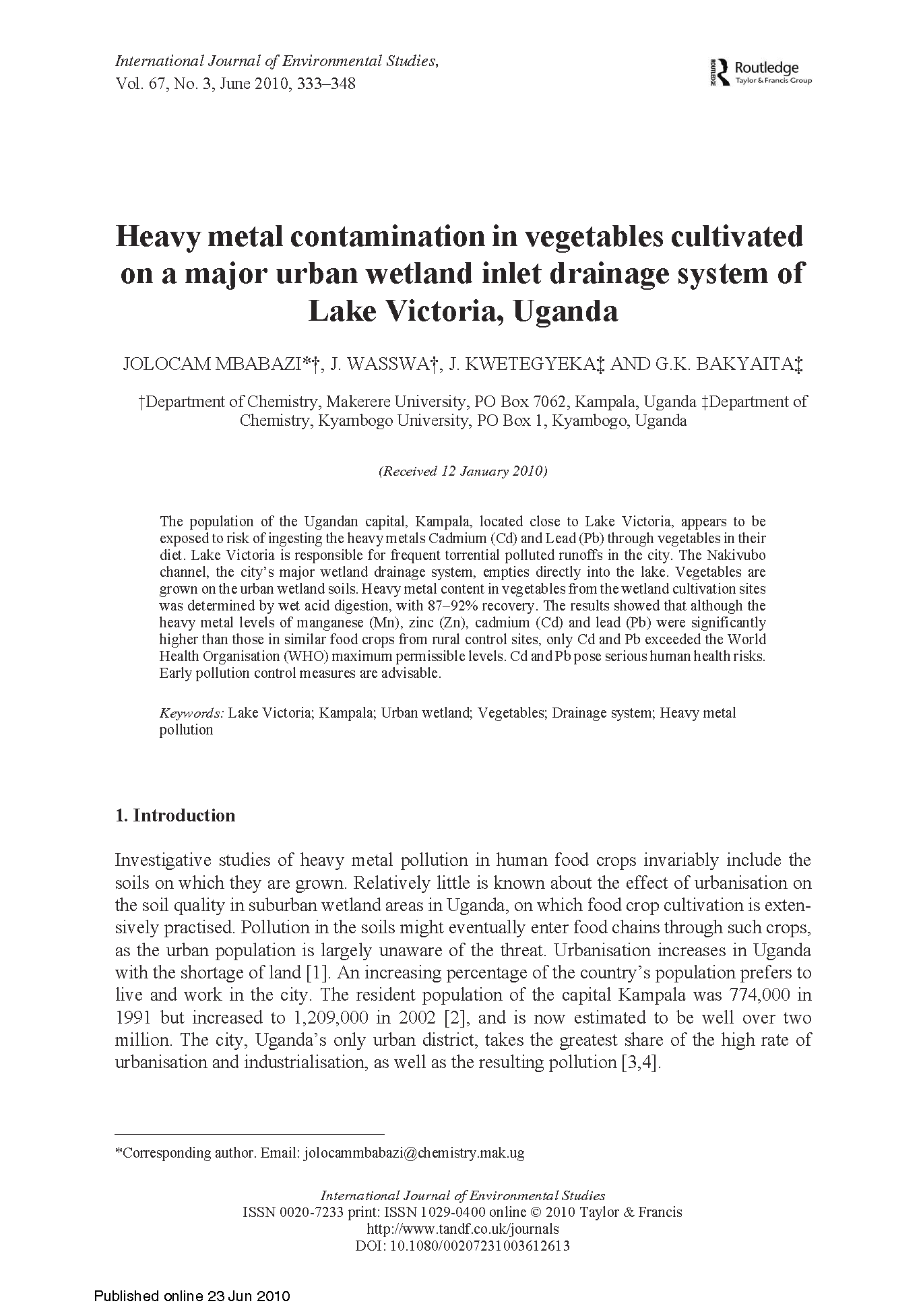 Heavy metal contamination in vegetables cultivated on a major urban wetland inlet drainage system of Lake Victoria, Uganda