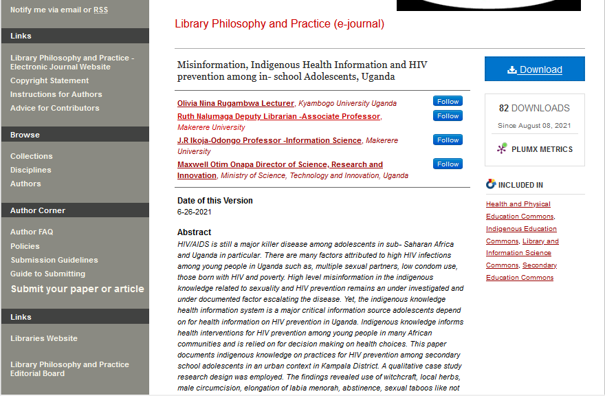 Rugambwa Lecturer, O. N. (2021). Misinformation, Indigenous Health Information and HIV prevention among in-school Adolescents, Uganda.